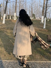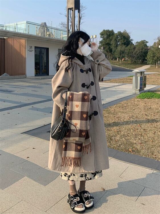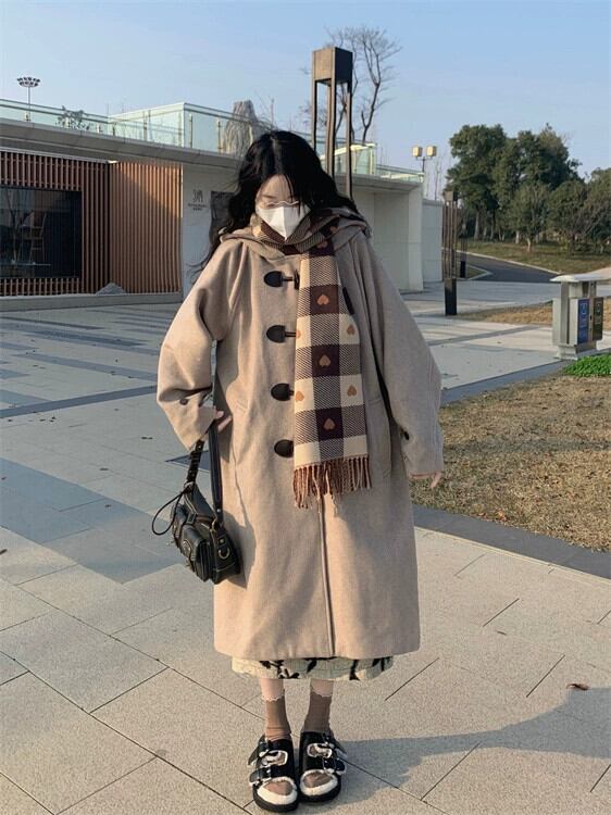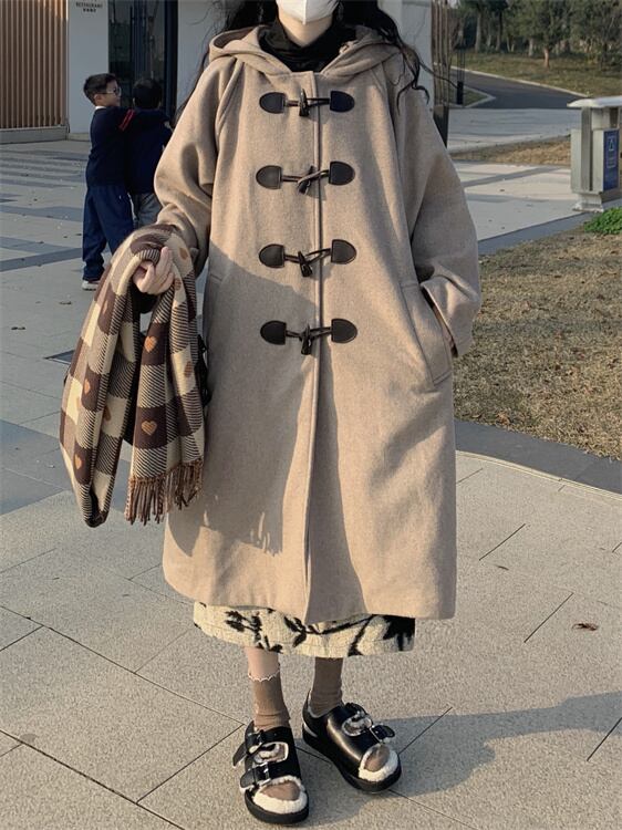 スタイルレトロフード付きホーンバックルウールコート女性の春と秋 2023 新しい肥厚ルーズミッドレングスコート スプリング 春物 オータム 秋物 0921945779940850