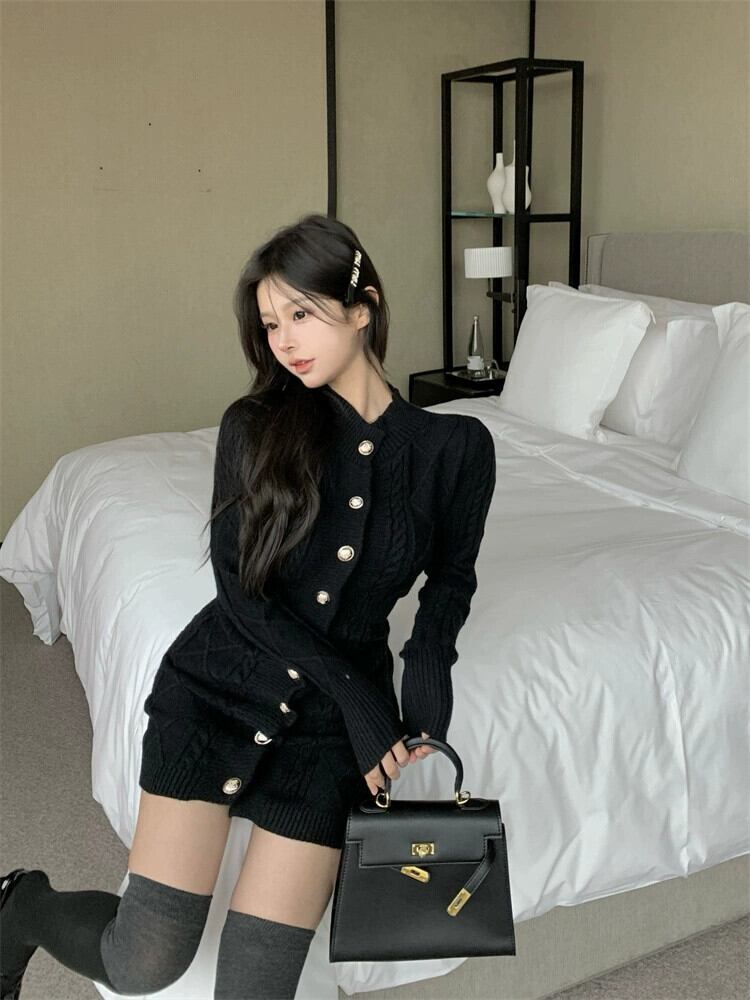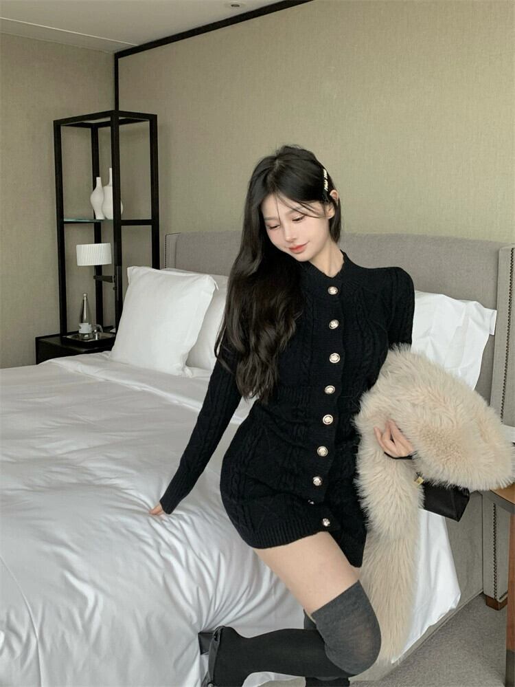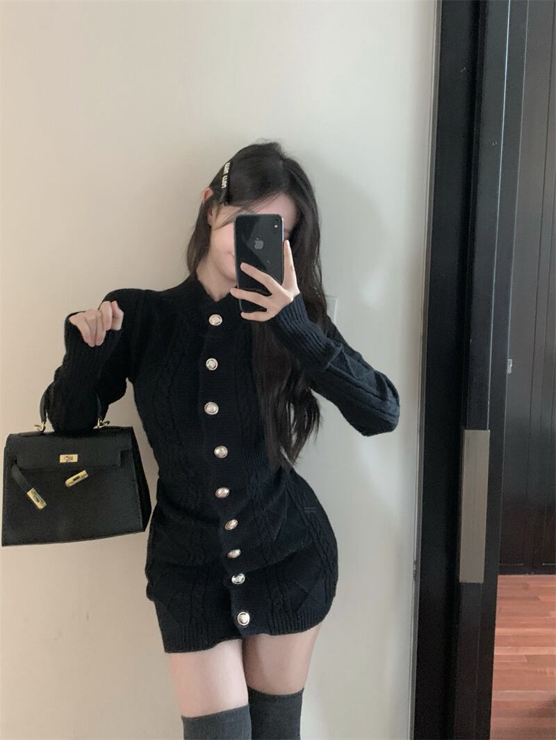 純粋な欲望セクシーな黒ニット長袖ドレス女性の春と秋 2023 新しいスリムスリムセーターバッグヒップスカート潮 ロング ブラック スプリング 春物 オータム 秋物 0921950688675757