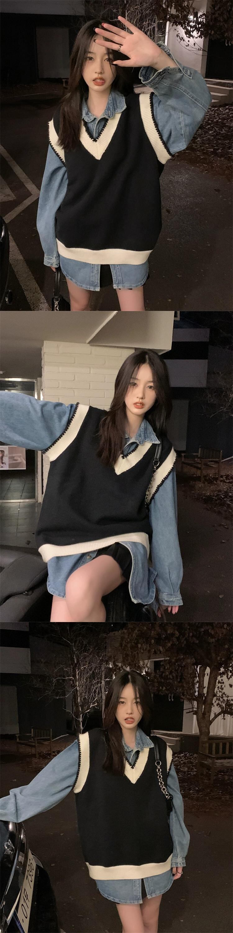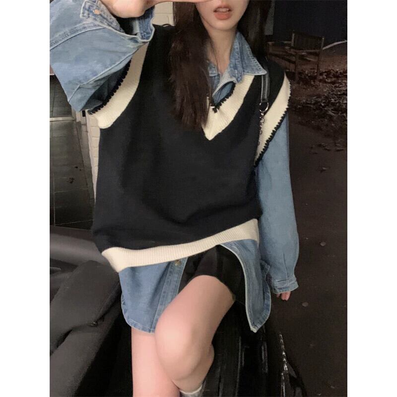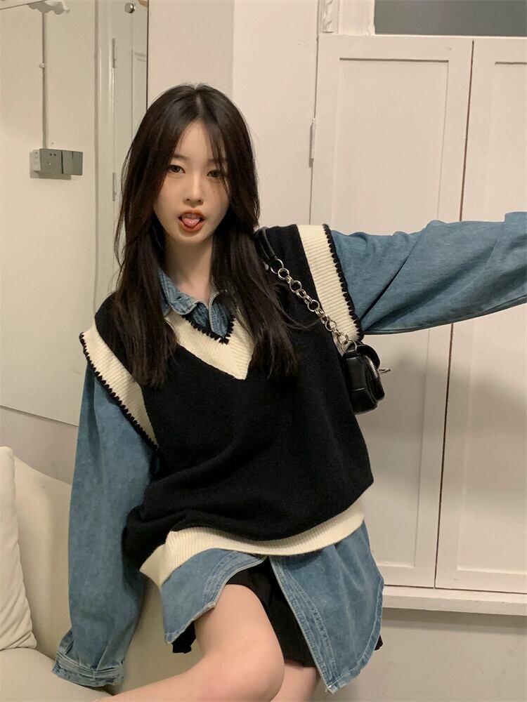 怠惰なカレッジスタイルのカラー V ネックルーズベスト女性の 2023 年春の新しいオールマッチ痩身レイヤードトップイン レッド スプリング 春物 Vネック 0921938396761840