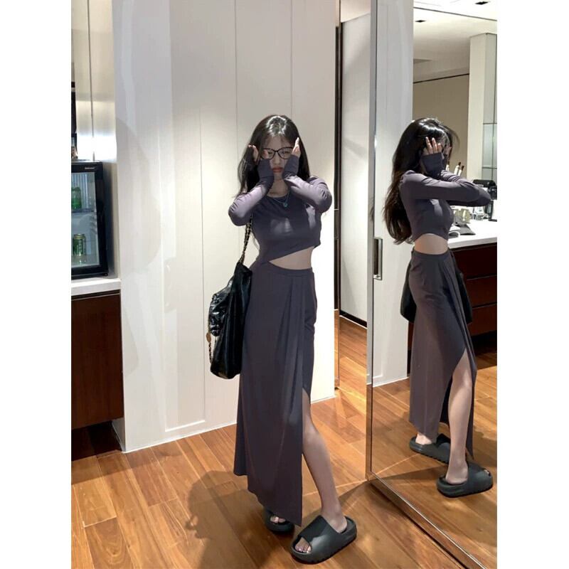 センスニッチ中空アウト長袖ドレスの女性の 2023 春の新作黒のロングスカート気質薄いスカート ブラック スプリング 春物 0921978848841935