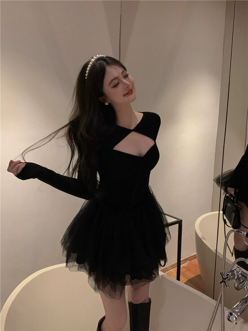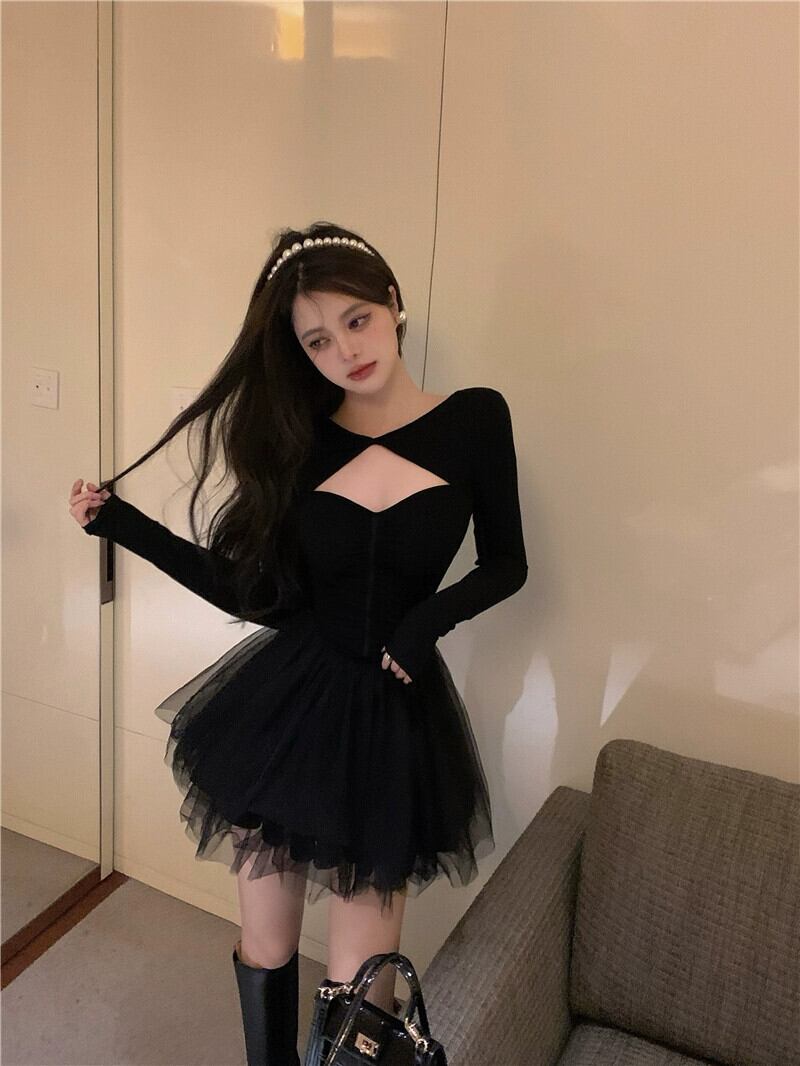 レトロセクシーな中空長袖ドレス女性春 2023 新しい純粋な欲望スタイルウエストふわふわリトルブラックドレス ロング スプリング 春物 ピュア 0921935159281578