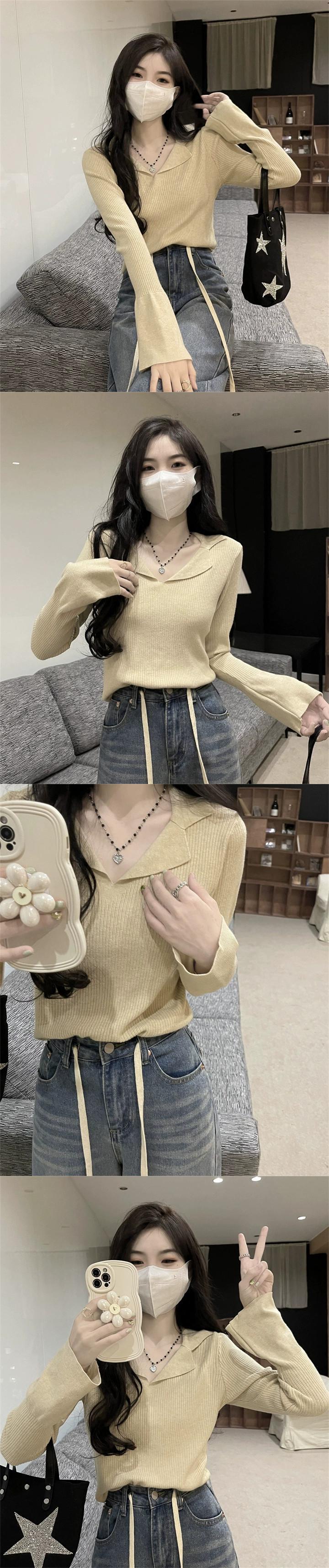 スパイスガールラペルショートプルオーバーニットウェア女性の春と秋 2023 スリムスリム長袖ボトムシャツトップ ロング スプリング 春物 オータム 秋物 092197270810567