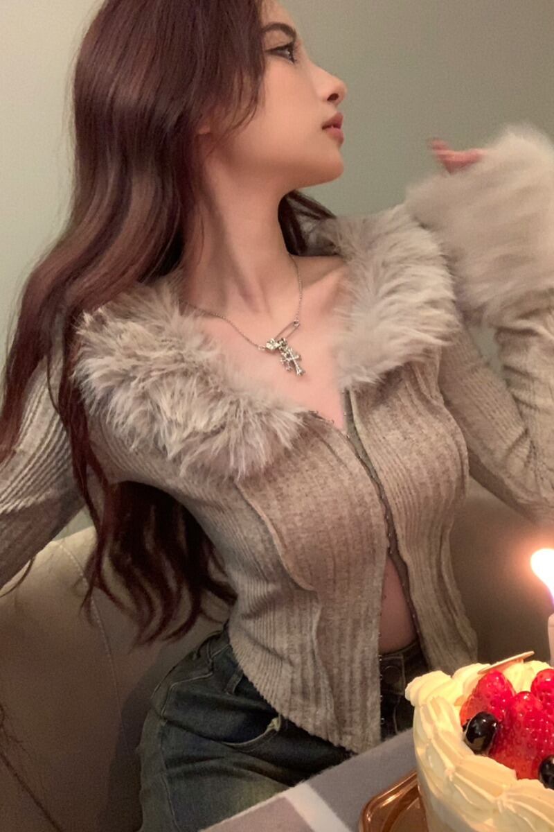 有能なデザインのステッチ毛皮のような長袖ニット カーディガン女性の 2023 年春の新しいスリム フィットと薄いジッパー トップ ロング スプリング 春物 0921948739248441