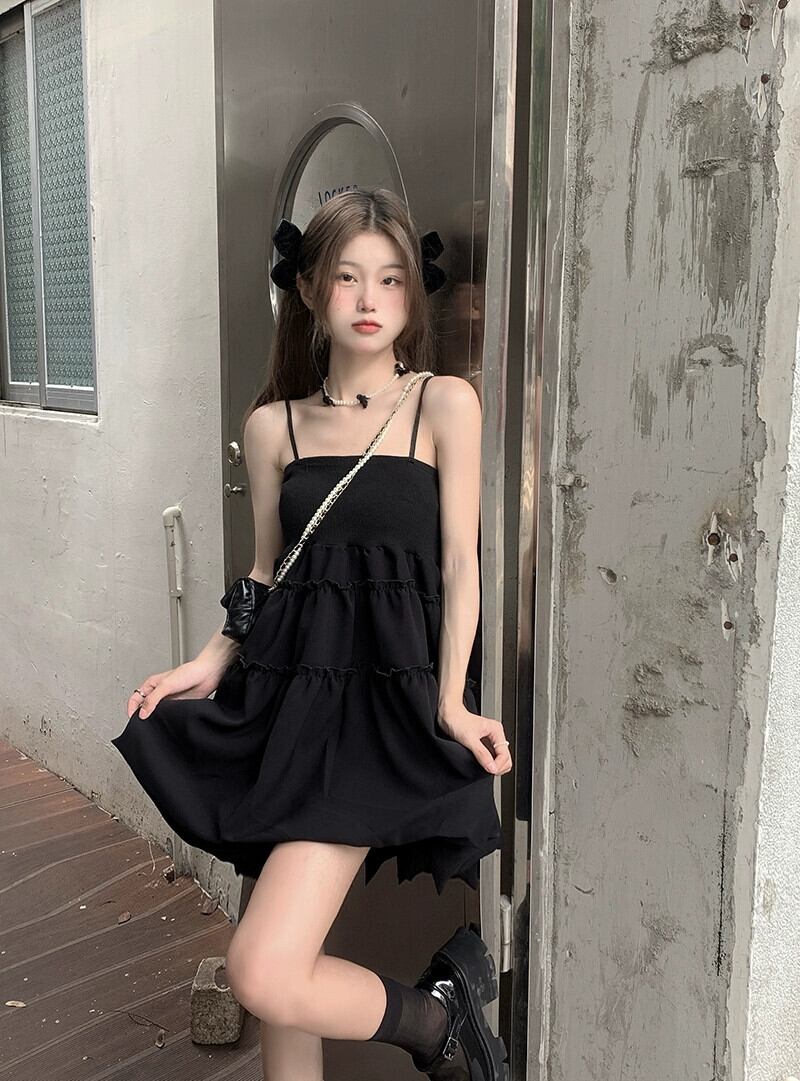 ヘップバーンスタイルのレトロな甘いサスペンダードレス女性の夏 2023 新しいオールマッチスリムふわふわ黒スカート ブラック 大人ガーリー スウィート キュート カジュアル サマー 夏物 0921966517938201