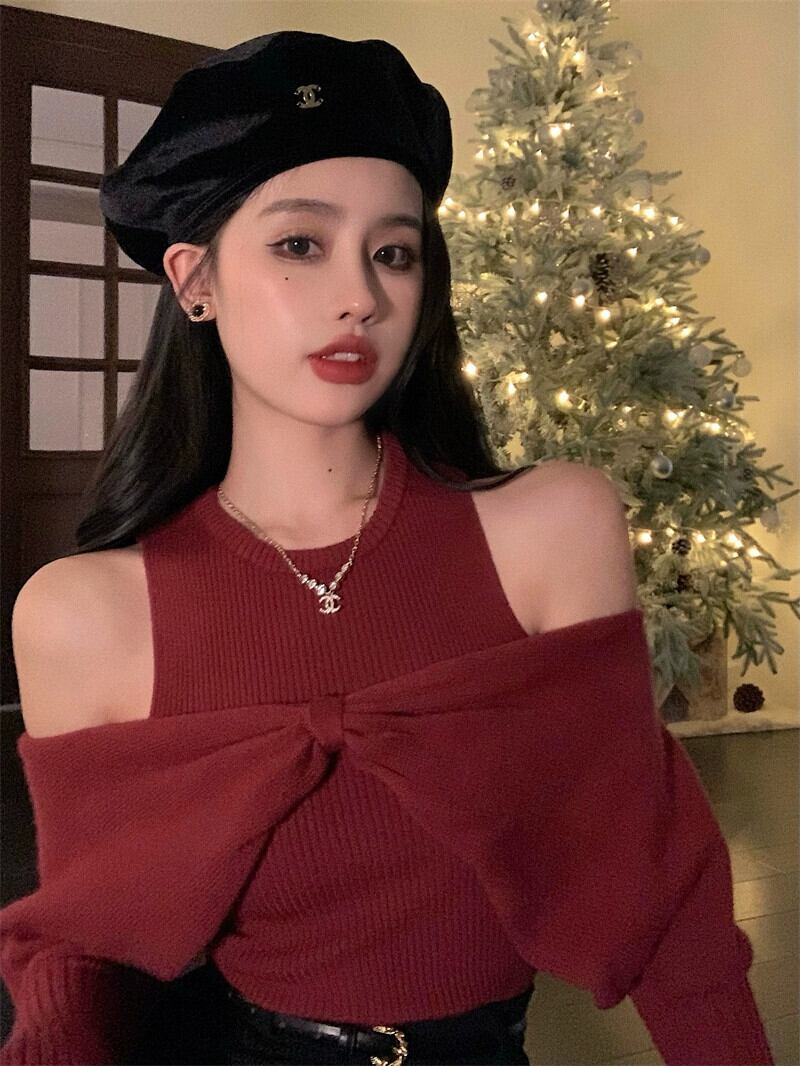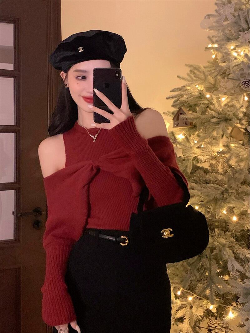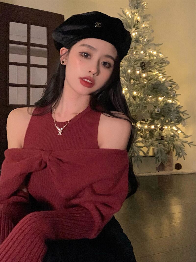 レトロな赤い気質偽ツーピースニットセーター女性の冬 2023 新しいデザインセンスニッチオールマッチ長袖セーター ロング レッド ウィンター 冬物 0921911951099292