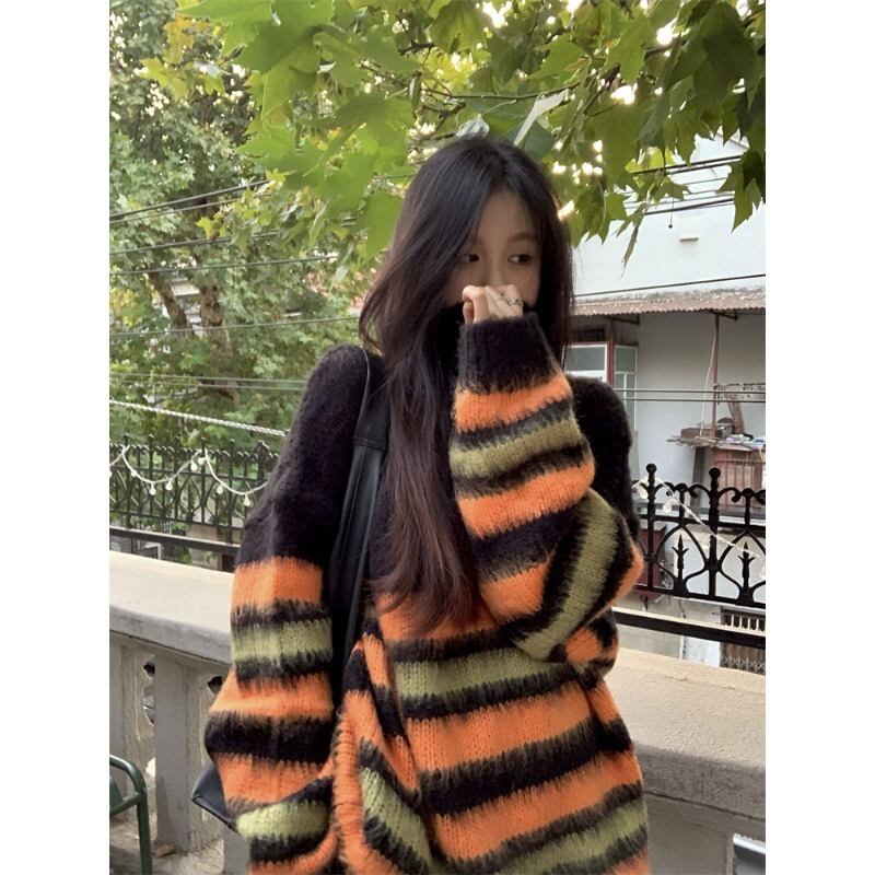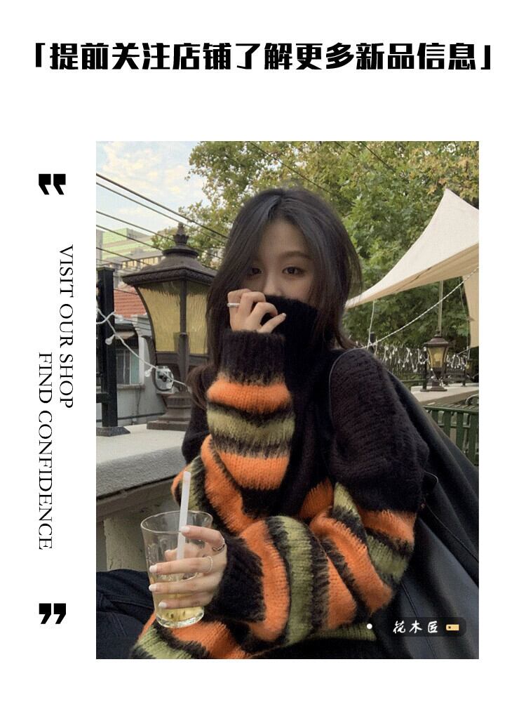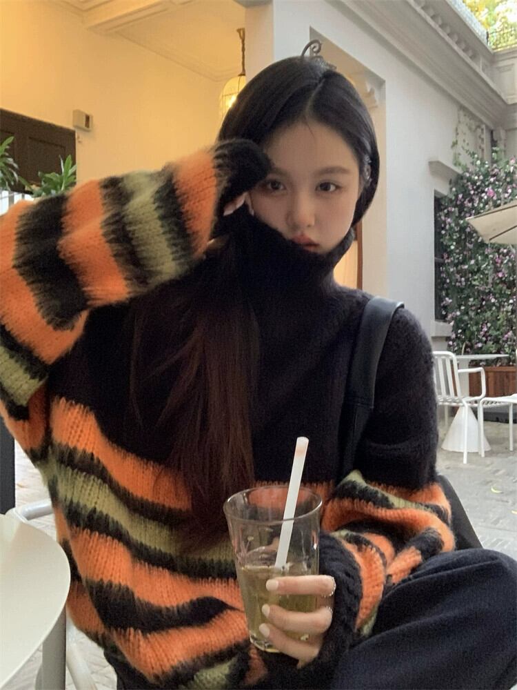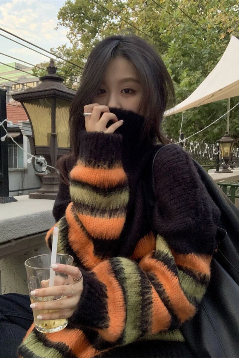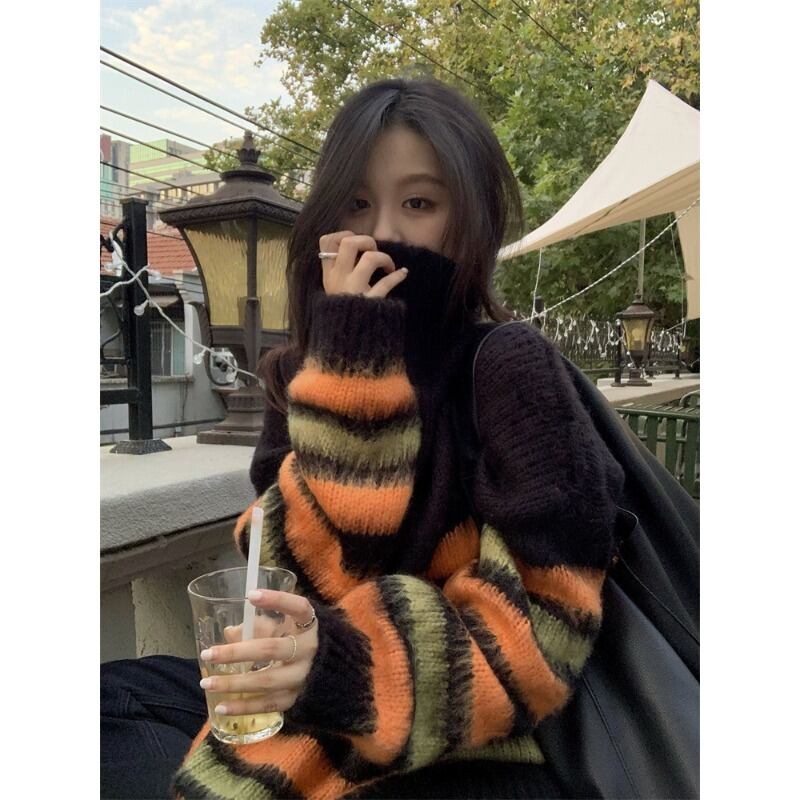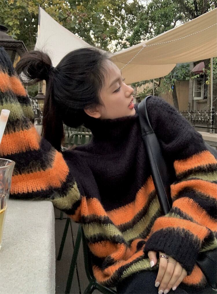 ゆったりとした怠惰な風カラーコントラストストライプタートルネックセーター女性の 2023 年春と秋の新しい気質オールマッチミッドレングスのトップトレンド スプリング 春物 オータム 秋物 0921942677473423