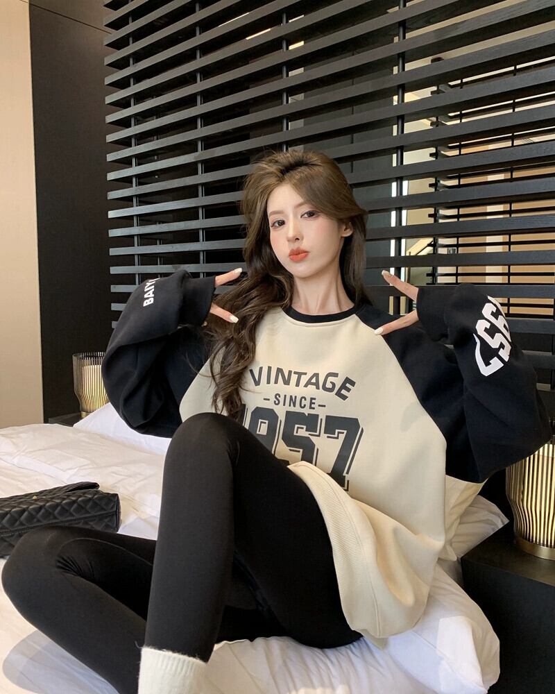アメリカンレトロレタープリント長袖セーターレディース2023春新作フリース暖かいミドル丈ルーズトップ ロング スプリング 春物 0921910966909621