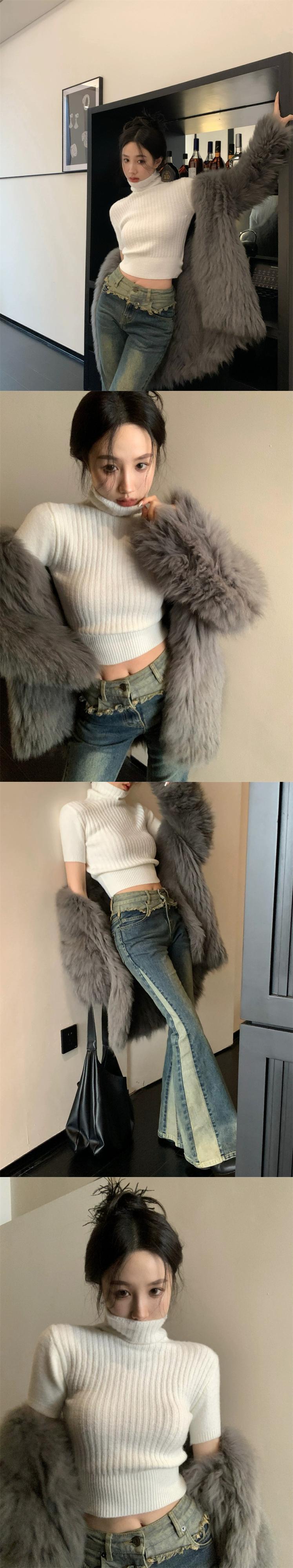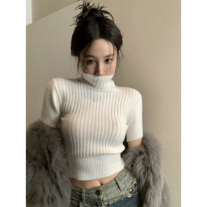 白いハイネック半袖ニットボトムシャツ女性の2023年春秋の新バージョンのスリムフィットオールマッチショートトップ ホワイト スプリング 春物 オータム 秋物 0921961435824498