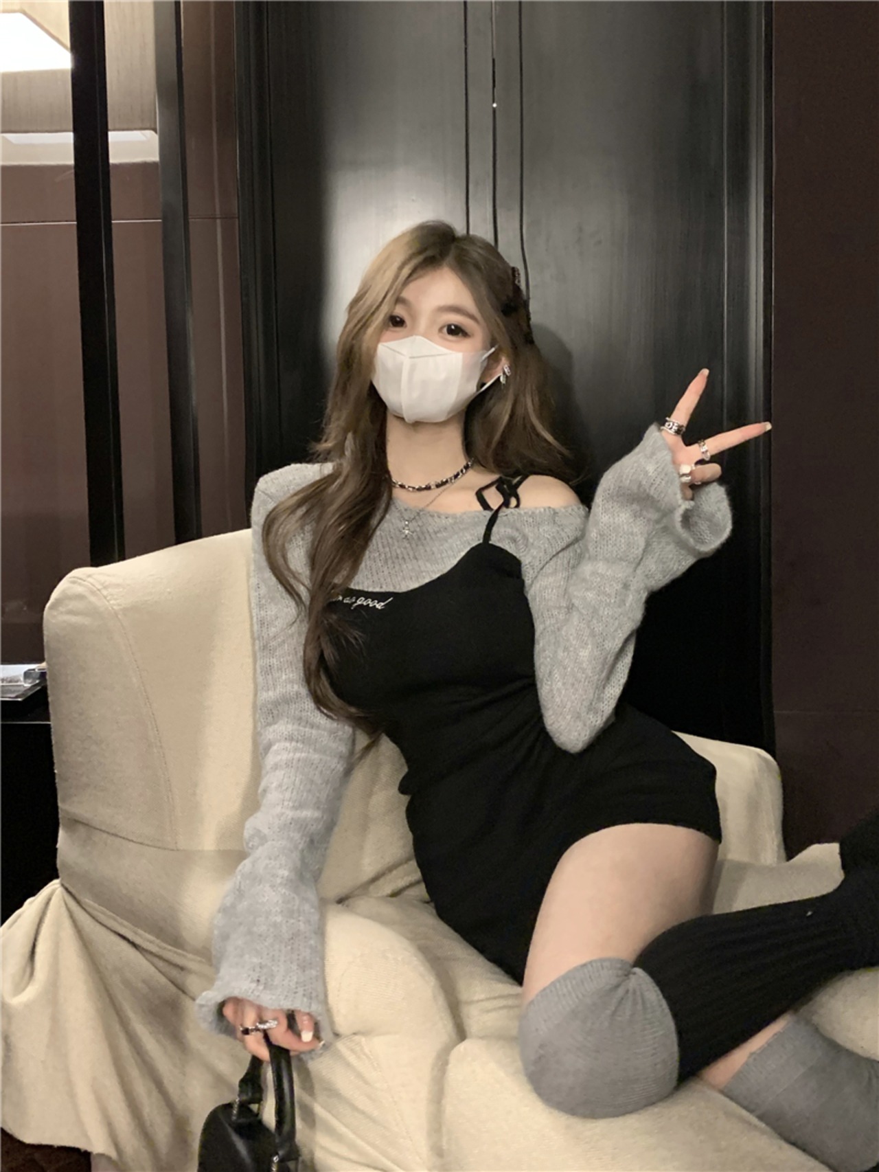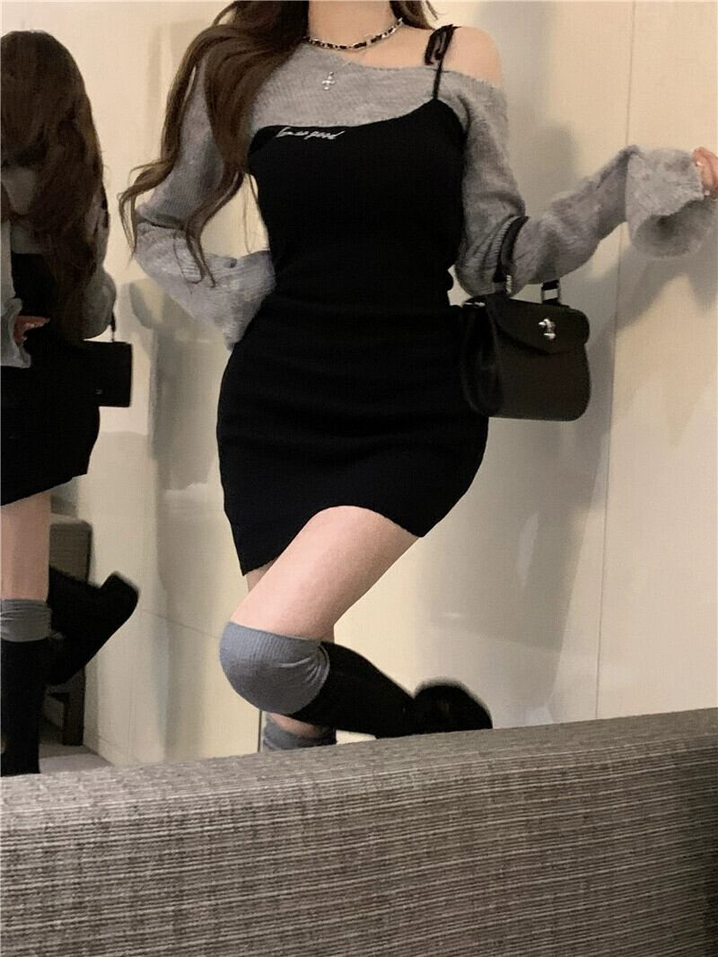 Sweet Spice Girl レースアップステッチニットドレス女性の春 2023 スリムウエストスリムオフショルダーバッグヒップスカート 大人ガーリー スウィート キュート カジュアル スプリング 春物 092196407082729