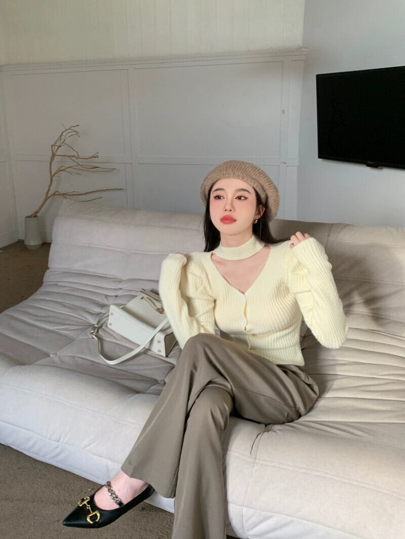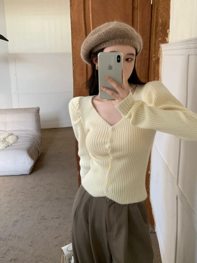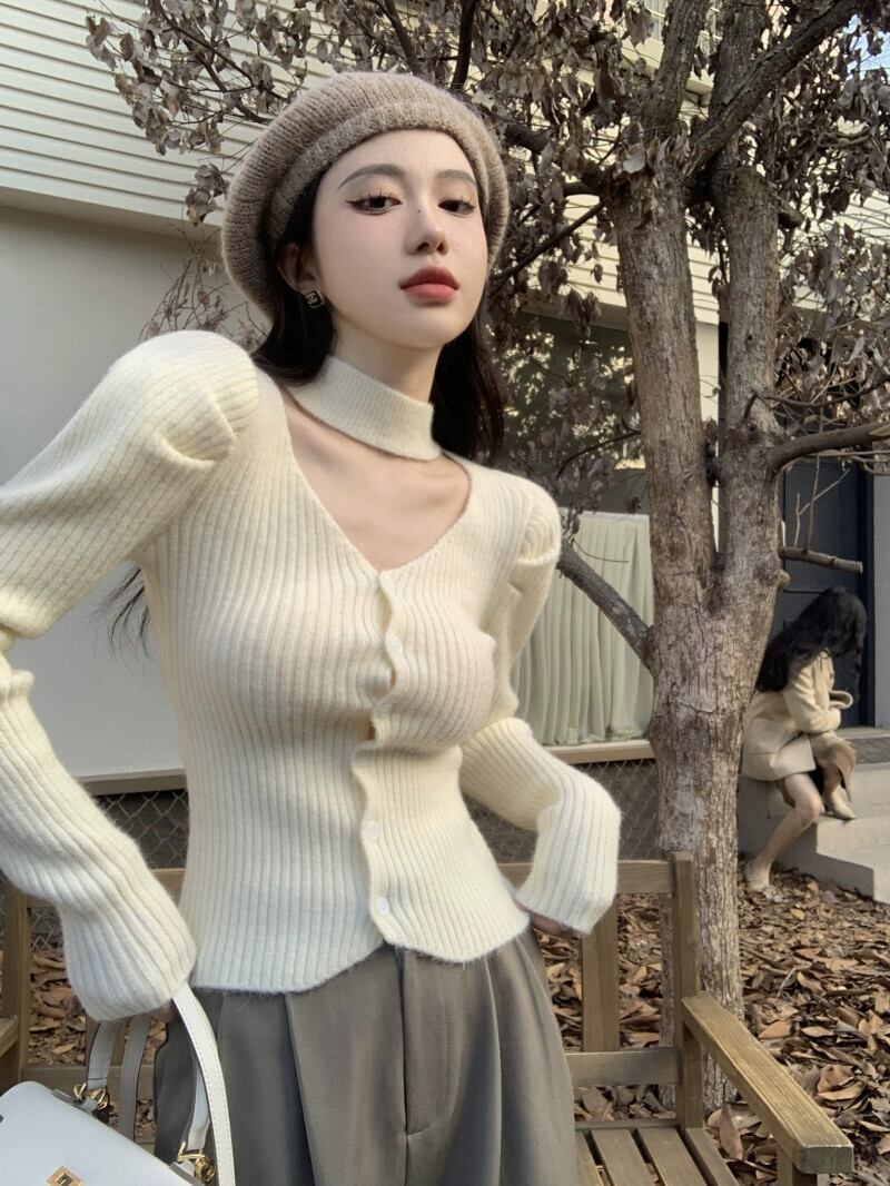 レトロ V ネックホルターネックセーター女性の 2023 春の新しいスリムフィットと薄い中空空気品質底インナーニットセーター スプリング 春物 Vネック 0921999860434499