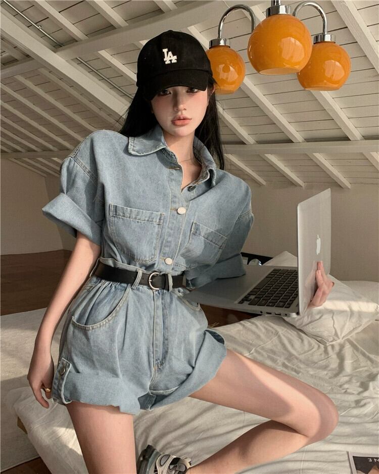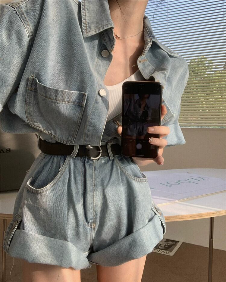 香港風ファッショナブルなデニムスーツの女性の2023年夏新作ゆったり半袖シャツハイウエストワイドレッグショーツ2点セット ハイウェスト サマー 夏物 ブルマー 0921997974848437