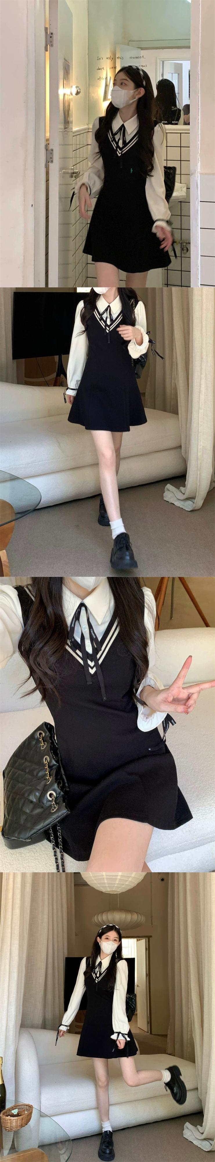 甘いカレッジスタイルフェイクツーピースドレスの女性の 2023 春の新しいデザインセンスコントラストカラーウエストスカート 大人ガーリー スウィート キュート カジュアル スプリング 春物 0921945485832509