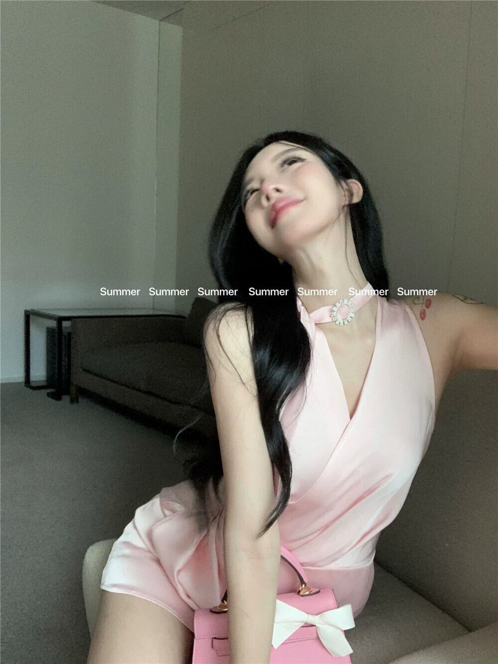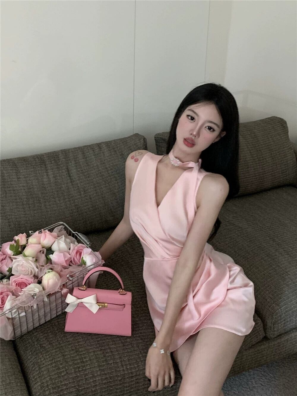 純粋な欲望のセクシーなノースリーブ V ネックドレスの女性の夏の 2023 新しいウエスト痩身ハイレベルプリーツ A ラインスカート サマー 夏物 Vネック Aライン 0921941311833598