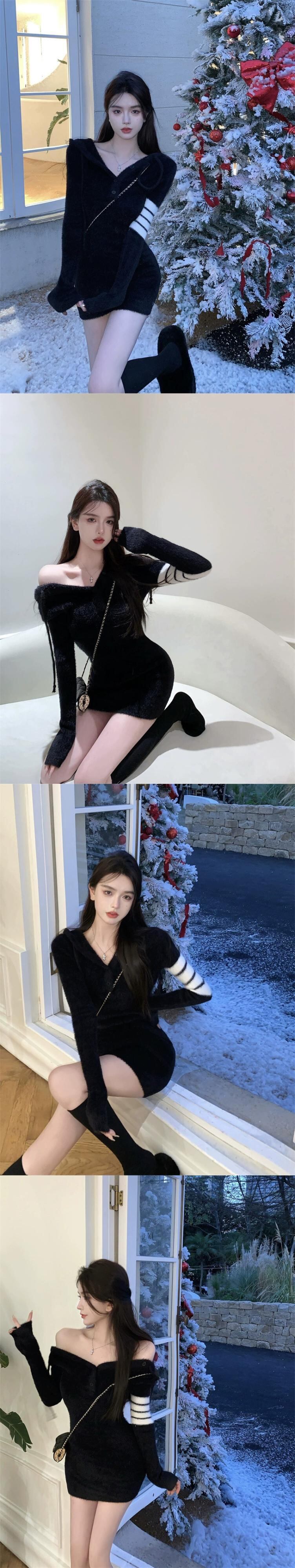 純粋な欲望のスタイルのセクシーな巾着フード付きニットドレスの女性の春 2023 新しいスリムフィットスリムバッグヒップセータードレス スプリング 春物 0921992312838043