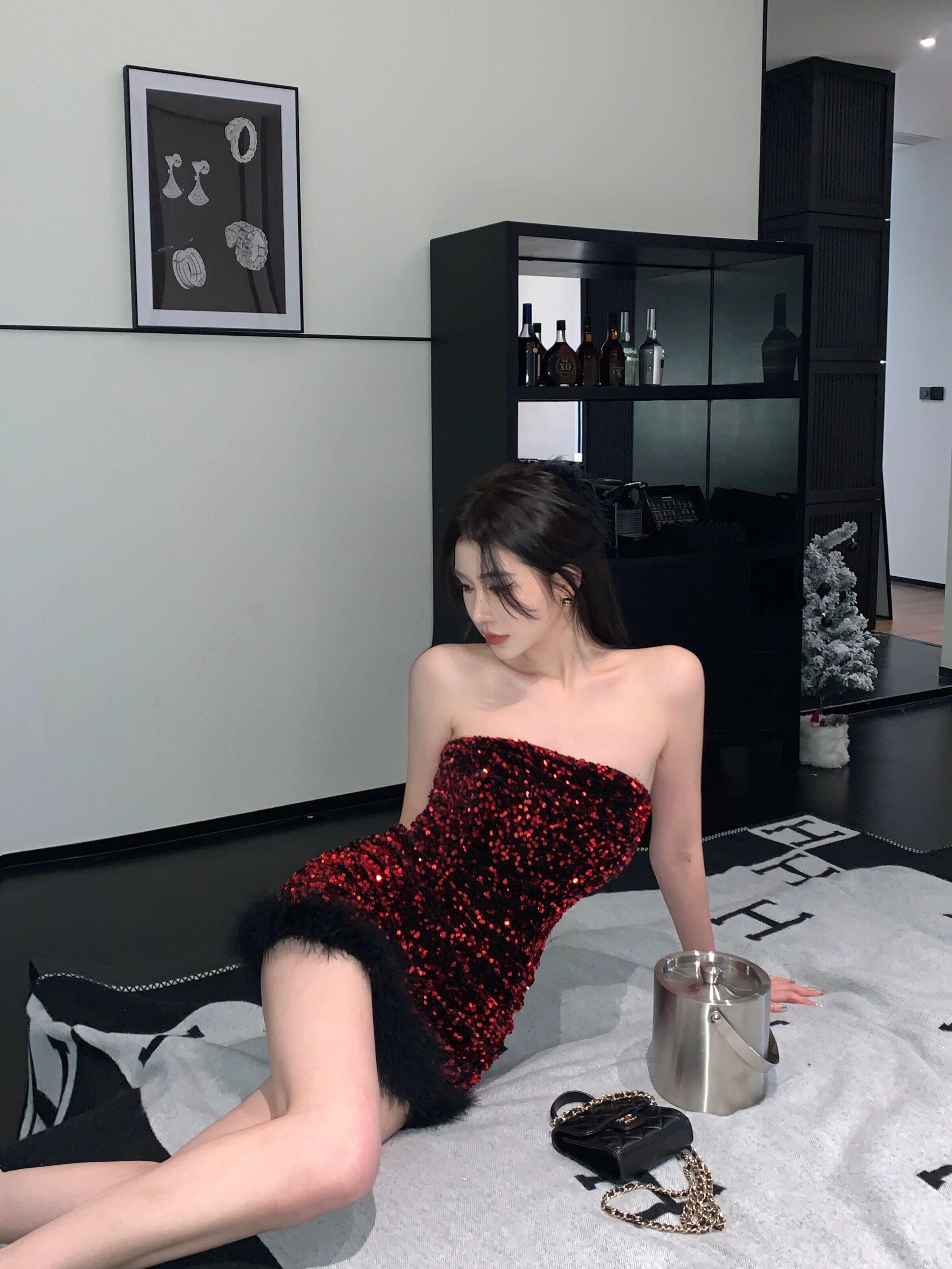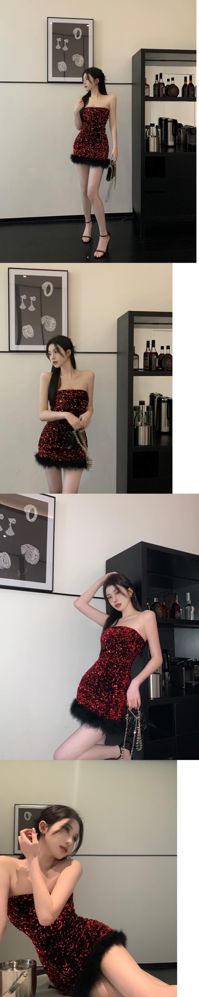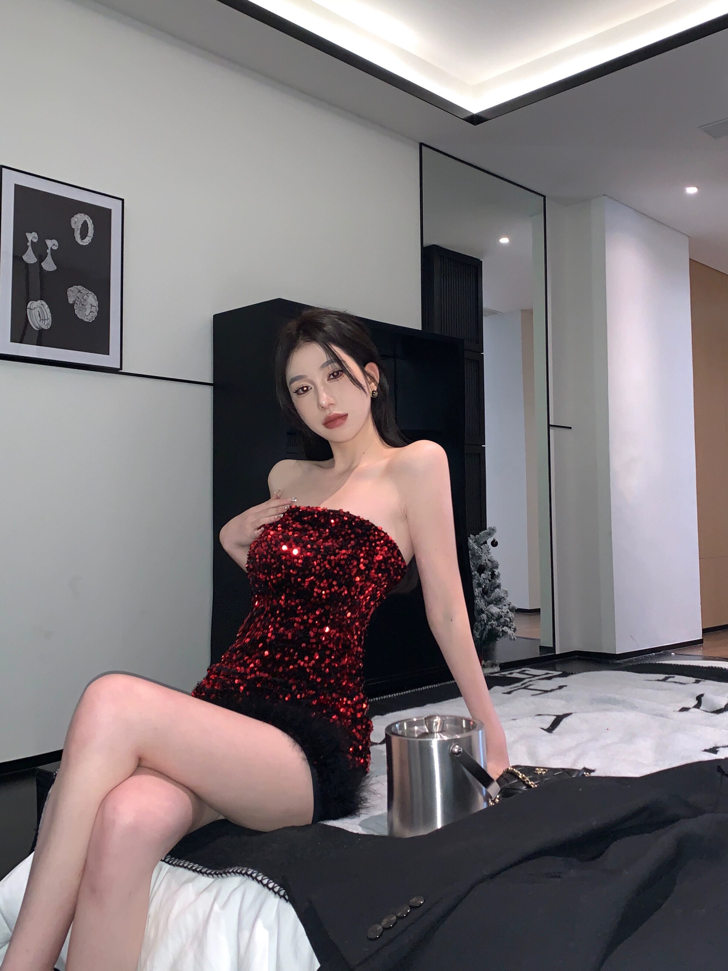 セクシーな純粋な欲望の女の子スパンコールチューブトップドレス女性の夏 2023 新しいスリムフィットスリムバッグヒップショートスカート潮 サマー 夏物 ピュア 0921910947702060