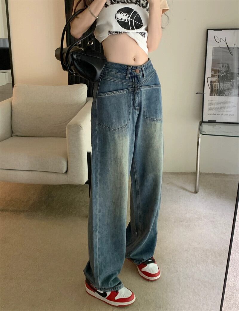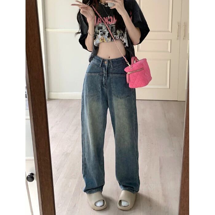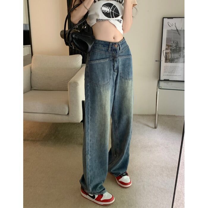 レトロコントラストカラーハイウエスト薄いジーンズ女性の夏の 2023 新しいドレープワイドレッグパンツルーズモップパンツトレンディ ハイウェスト サマー 夏物 0921920470507738