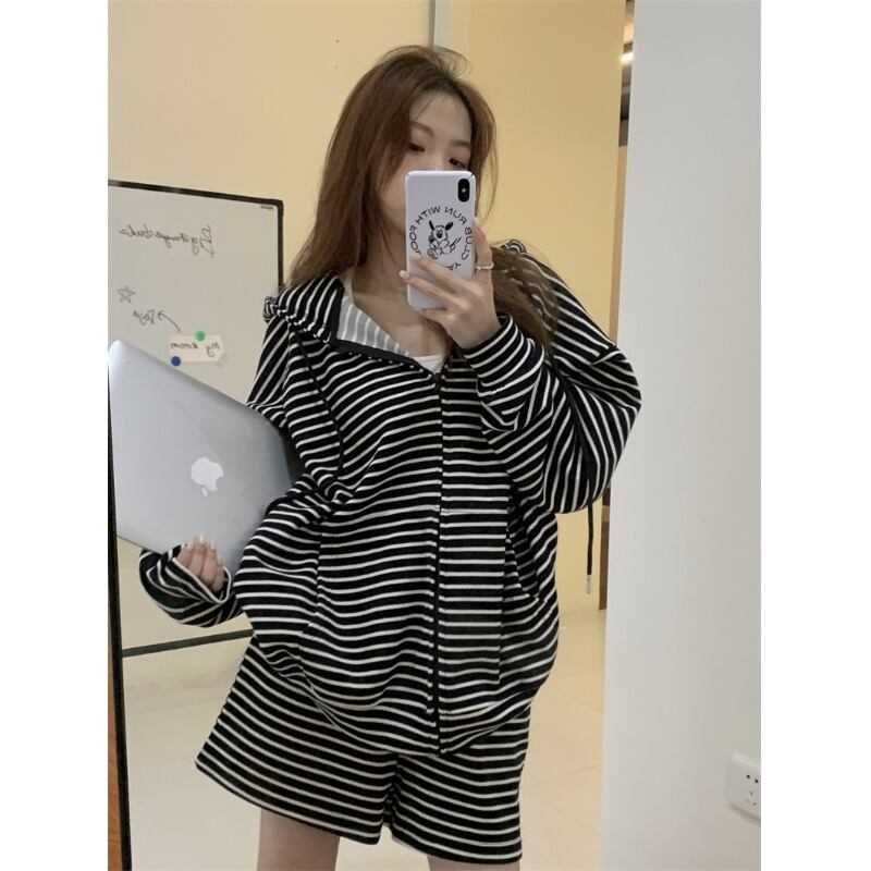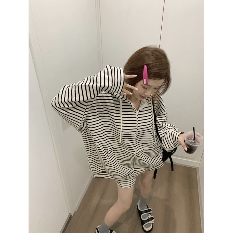 スポーツスーツ女性の 2023 年初春新作ルーズフード付きセータージャケットストライプ薄手ショーツ 2 点セット スプリング 春物 ブルマー 0921939782705033