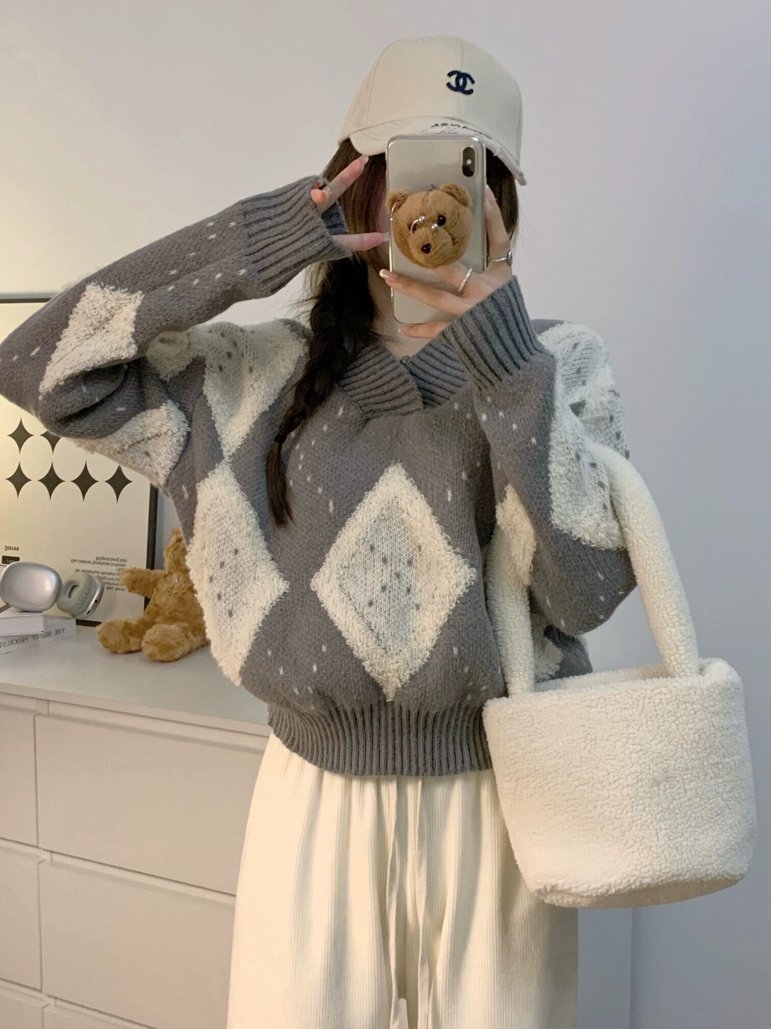 レトロ怠惰なスタイル V ネック菱形セーター女性の 2023 春の新コントラストカラールーズプルオーバー長袖ニットトップ ロング スプリング 春物 Vネック 0921986795847947