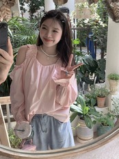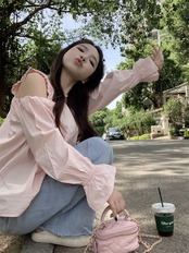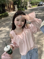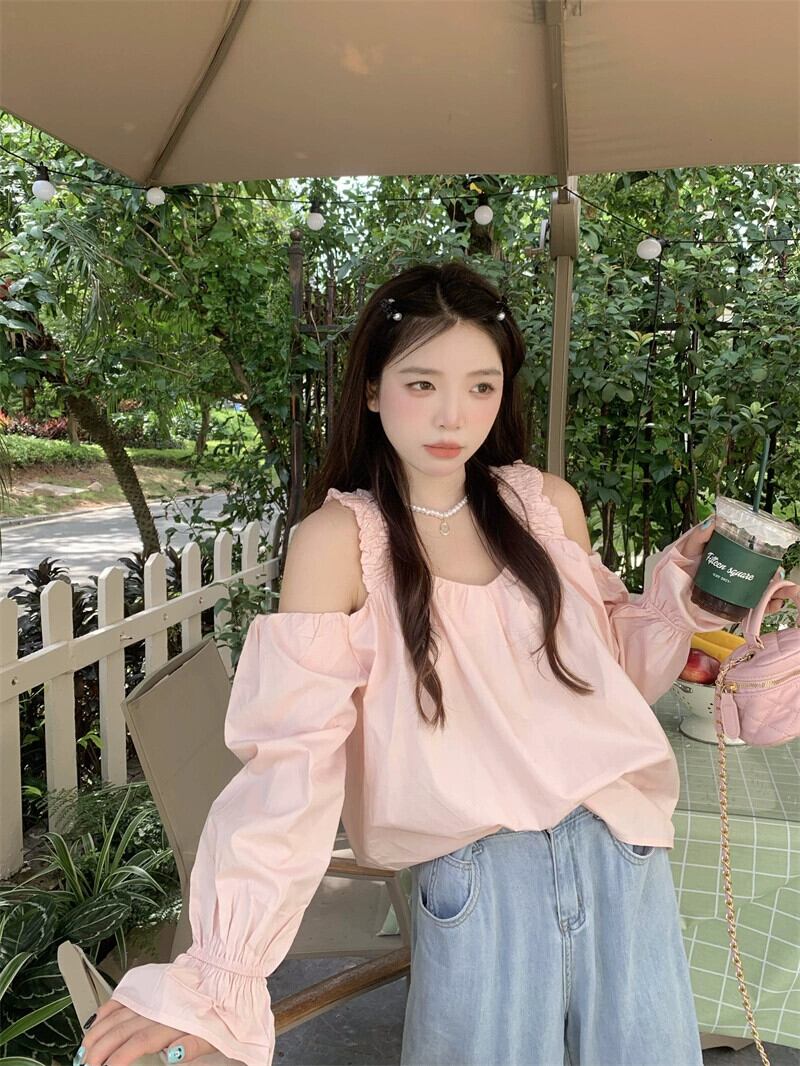 洋風の甘くて年齢を減らすピンクのシャツの女性の2023年夏新しいデザイン感覚のオフショルダーケアマシンルーズシャツ 大人ガーリー スウィート キュート カジュアル サマー 夏物 0921915447000040