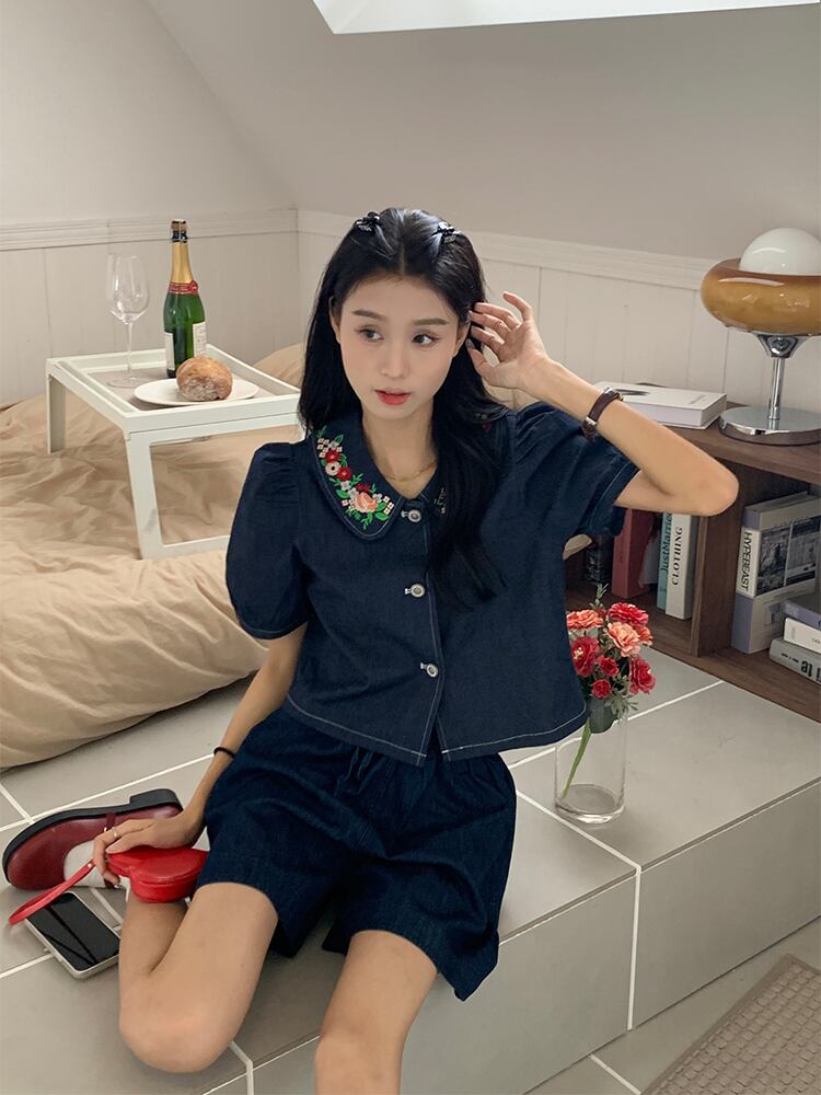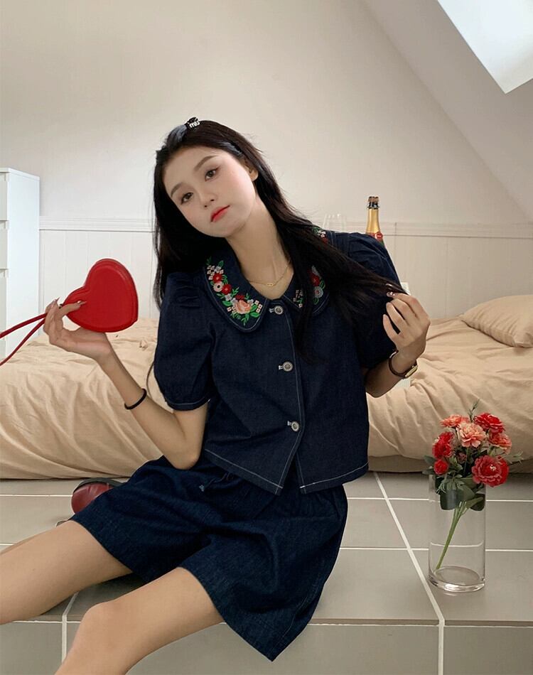 バイタリティスーツ女性の夏 2023 新しい刺繍ポロカラーデニムトップハイウエストショートパンツツーピーストレンディ ハイウェスト レッド サマー 夏物 ショーツ ブルマー 0921978066494162
