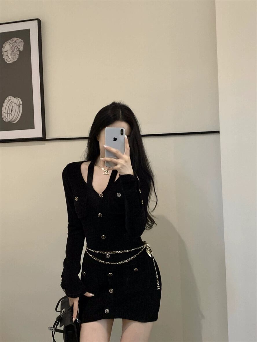 気質と小さな香りの黒の吊りネック長袖ドレスの女性の春と秋の 2023 年の新しいスリムフィットと薄いバッグヒップショートスカート潮 ロング ブラック スプリング 春物 オータム 秋物 0921926083175583