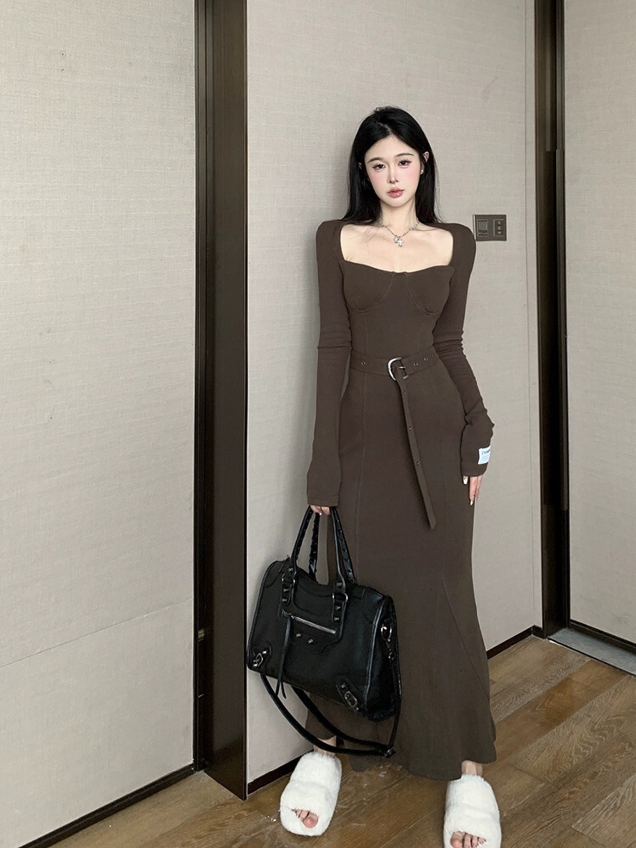 スパイススタイルスクエアカラー長袖ドレス女性の春と秋2023新しいオールマッチ自己修養スリムボトムマーメイドロングスカート潮 スプリング 春物 オータム 秋物 スクウェア 0921921295362855