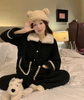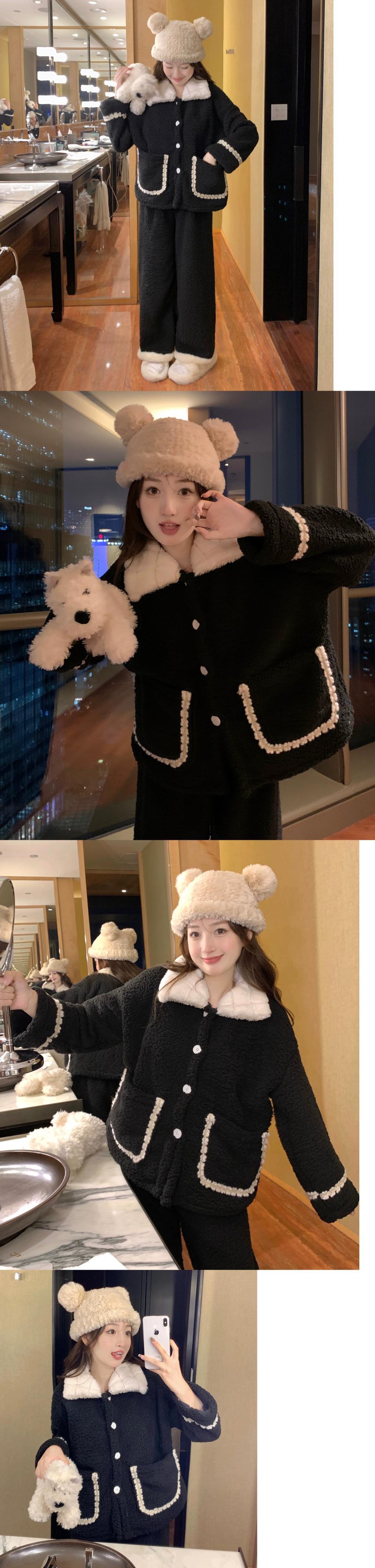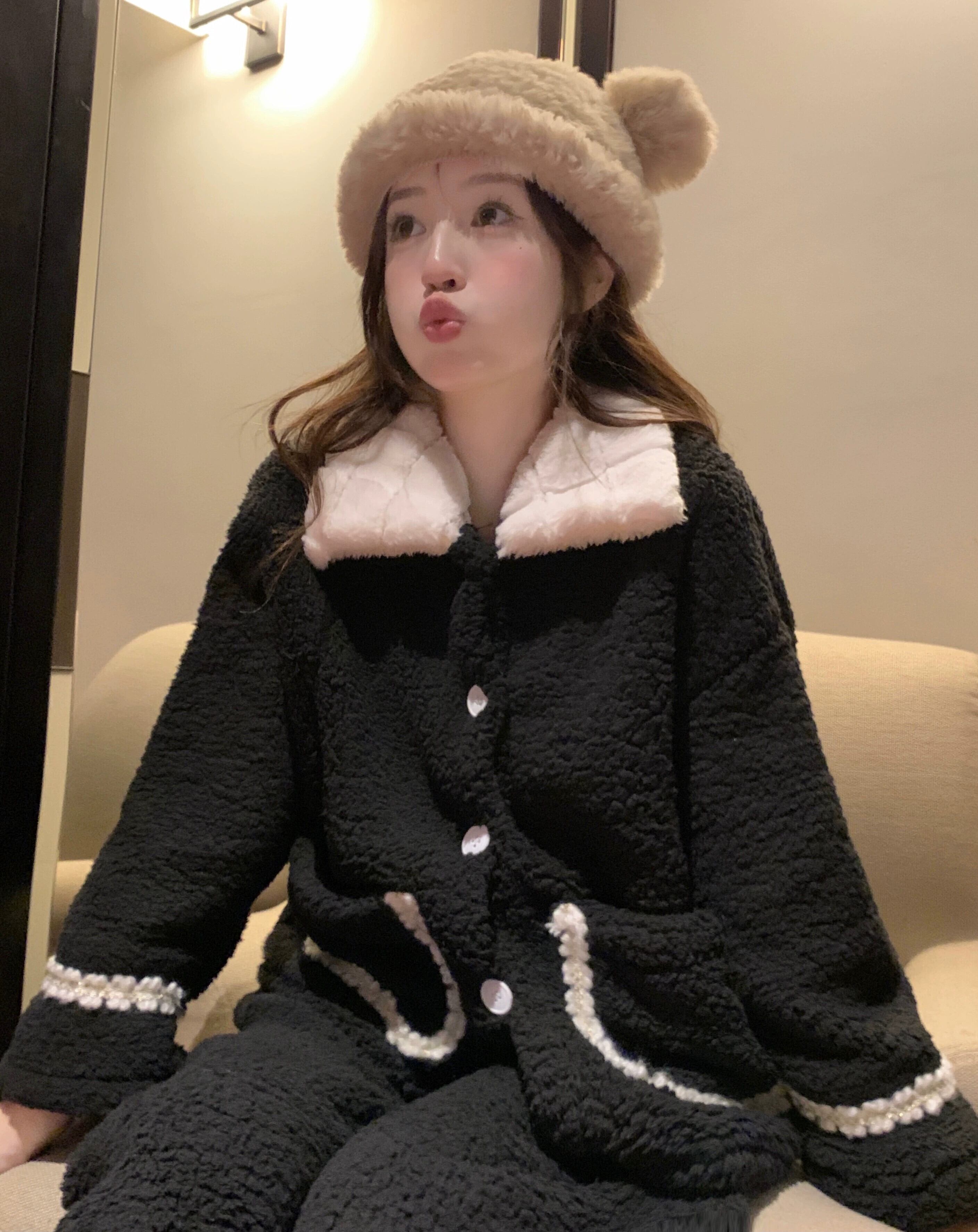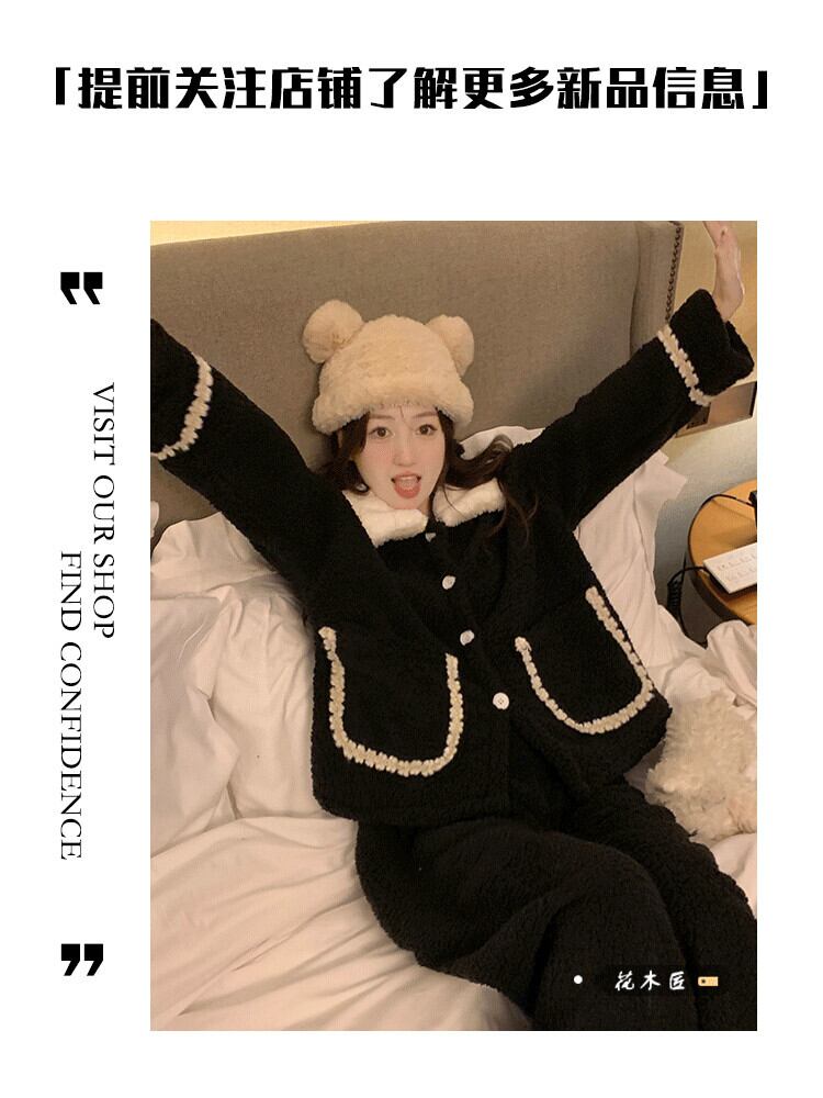 レトロパジャマセット女性の冬 2023 厚手ステッチコーラルフリートップパジャマパンツホームサービス 2 点セット ウィンター 冬物 0921944741467402