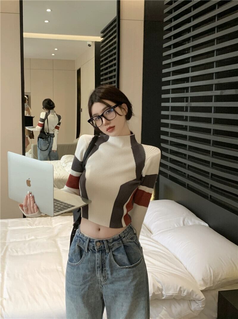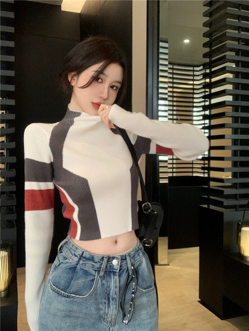 アメリカン、おへそ露出、カラーマッチングハイカラーニットセーターレディース2023年春新作スリムフィット、薄手ショートボトムトップ スプリング 春物 0921911188419569