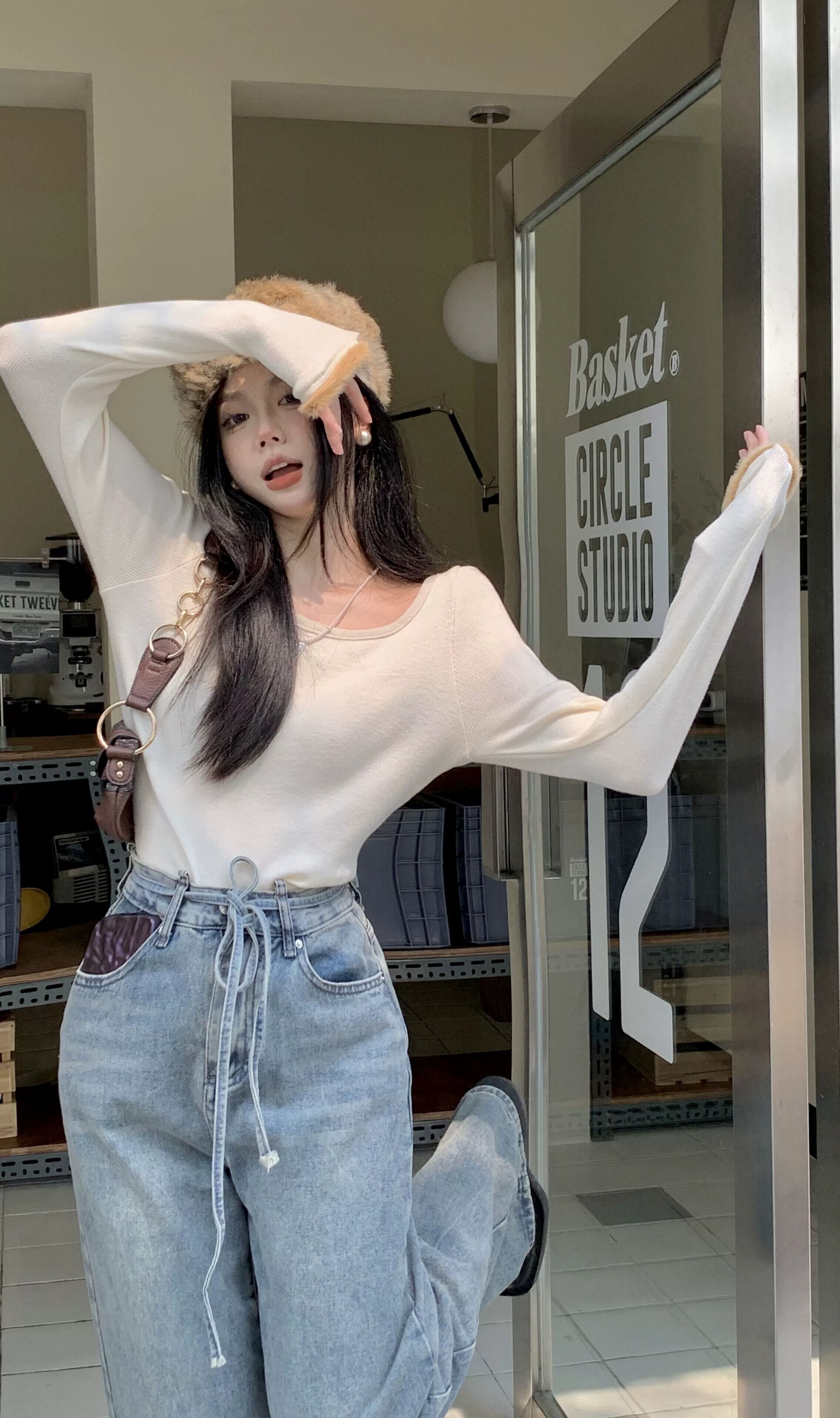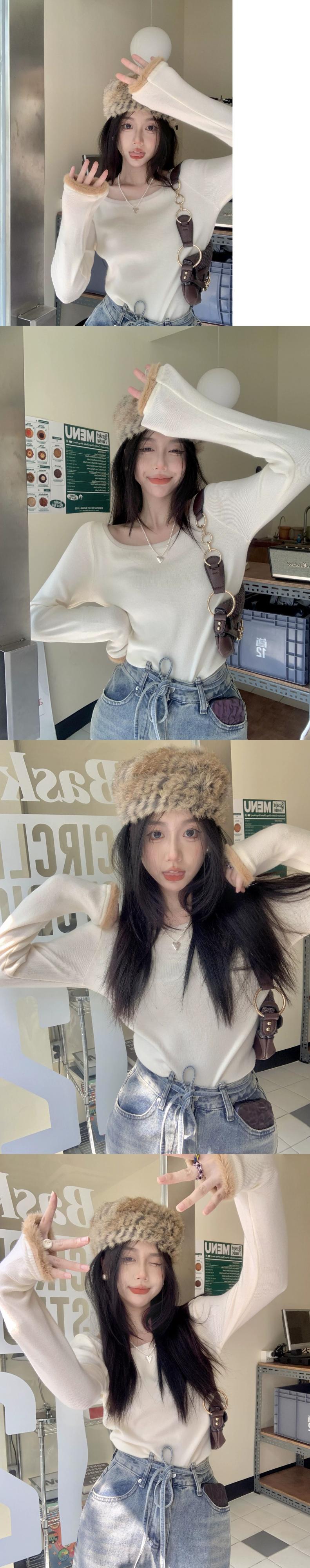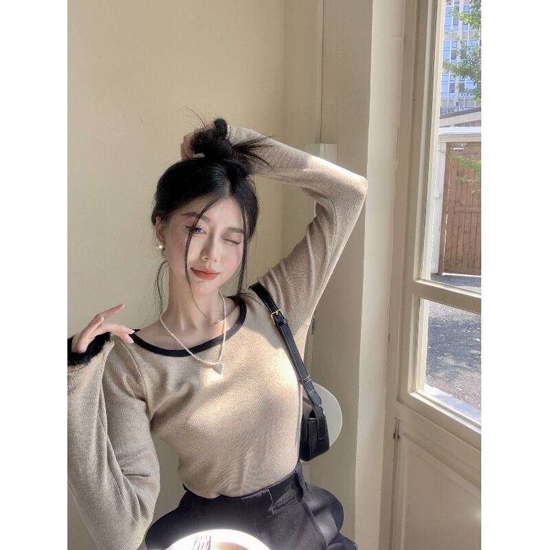 コントラストカラーの U ネックオールマッチ長袖ニットセーターレディース 2023 年春の新作スリムフィットと薄い弾性ショートボトミングトップ ロング エラスティック 伸縮 スプリング 春物 0921944021041265