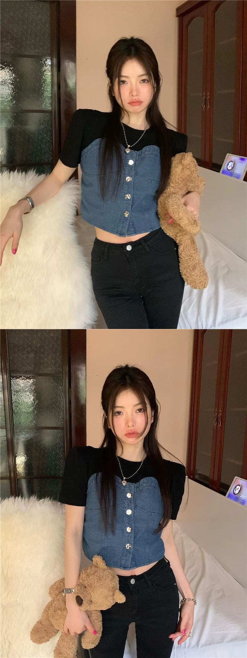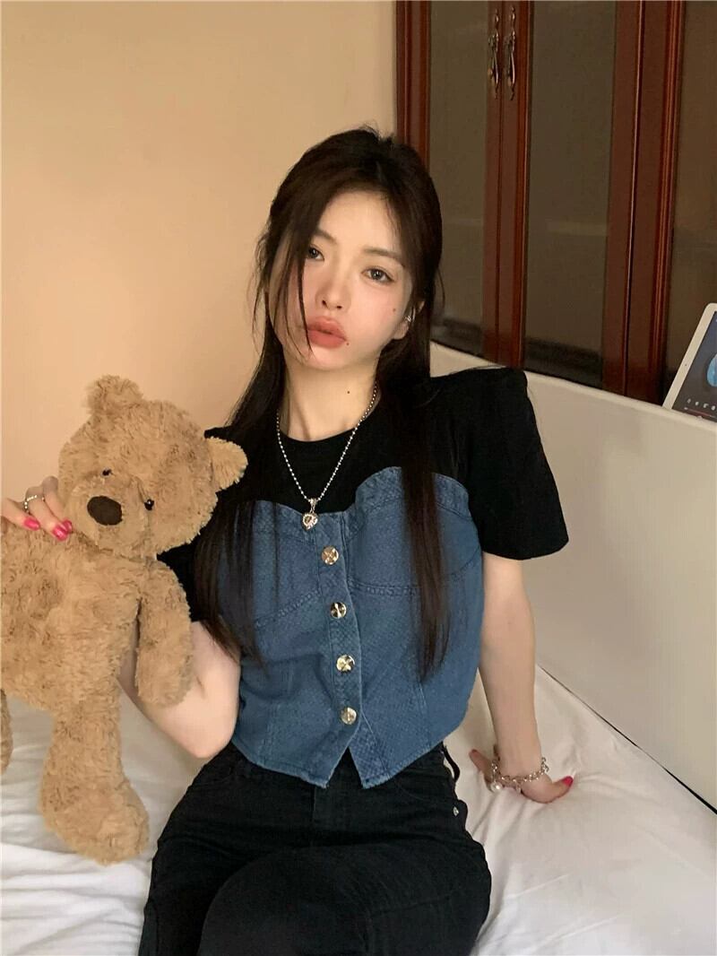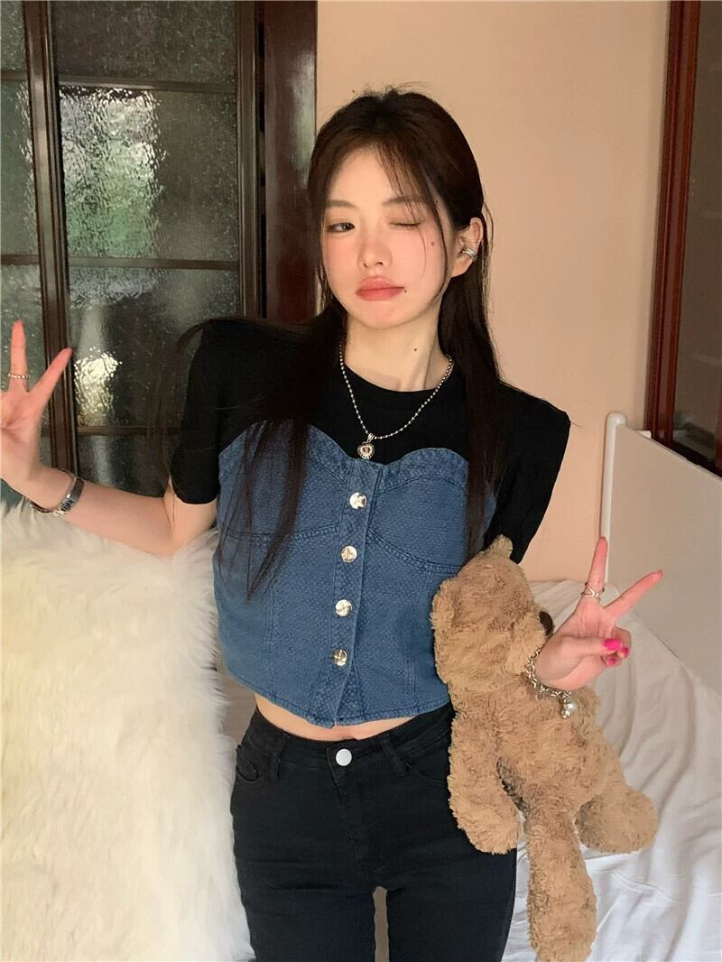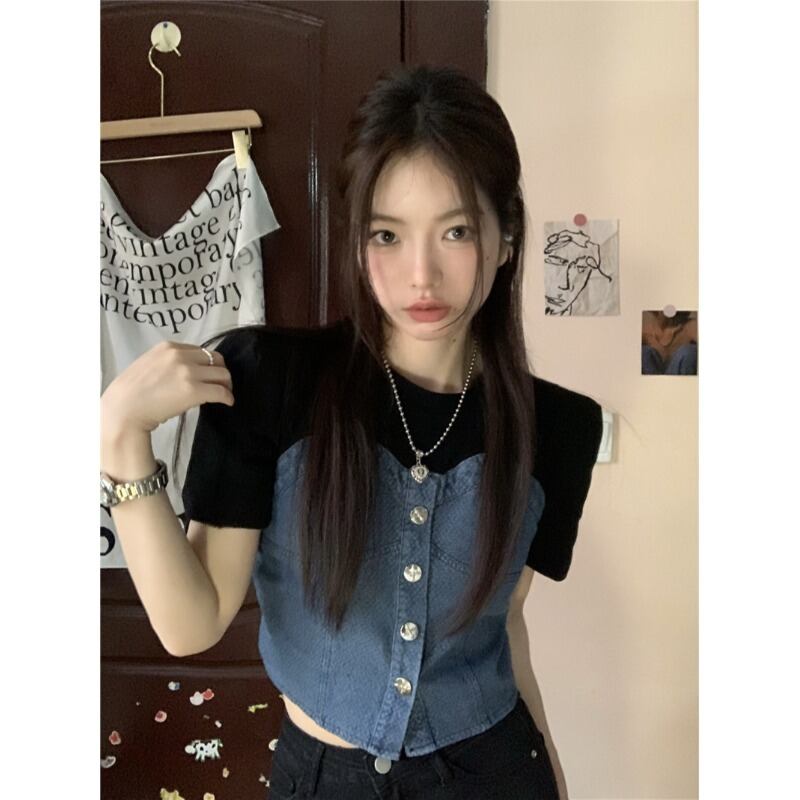 バージョンステッチデニムフェイクツーピース半袖 Tシャツ女性の夏の 2023 新しいニッチデザインショートトップ サマー 夏物 0921989114799255