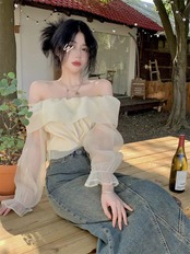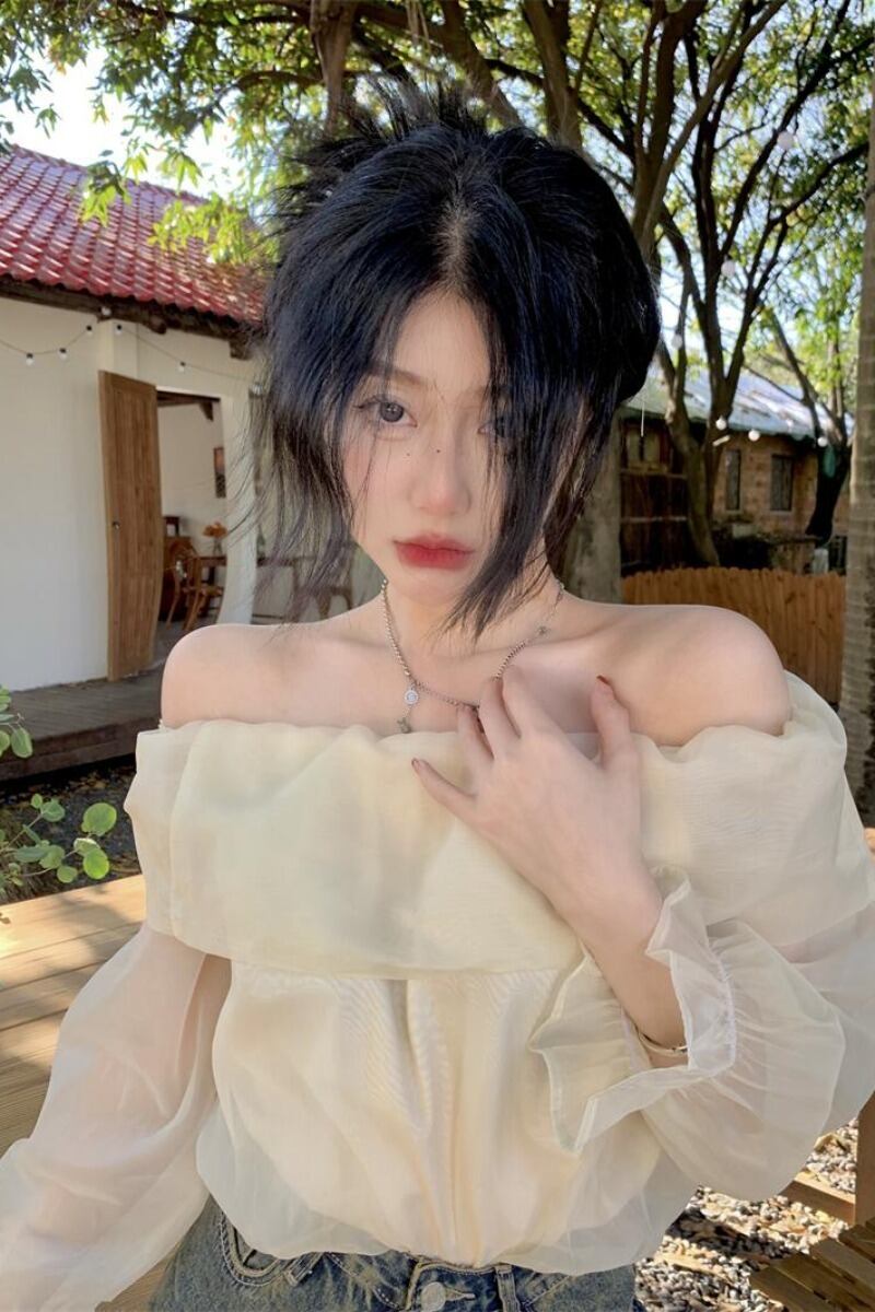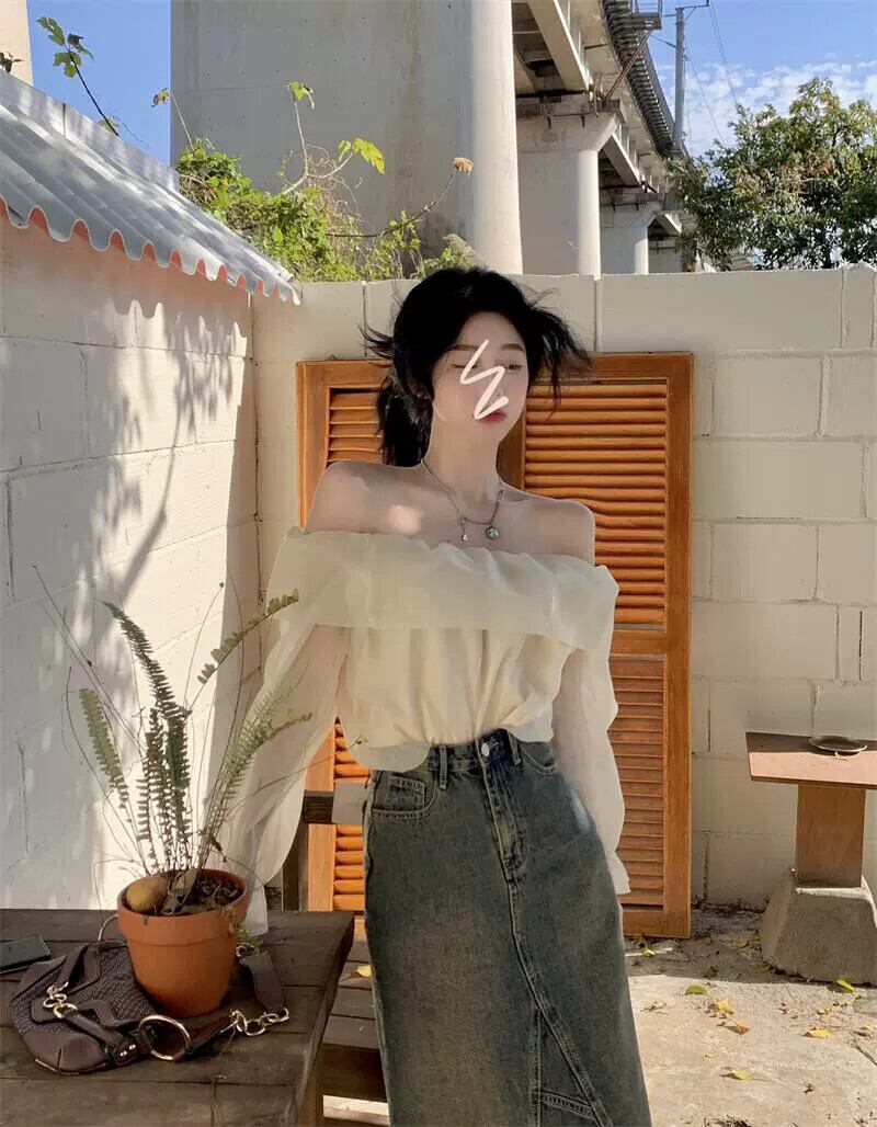 フランスのワンショルダー長袖シャツ女性の 2023 夏の新しいルーズストラップレスデザインシックな妖精のトップ ロング サマー 夏物 0921974347067735