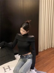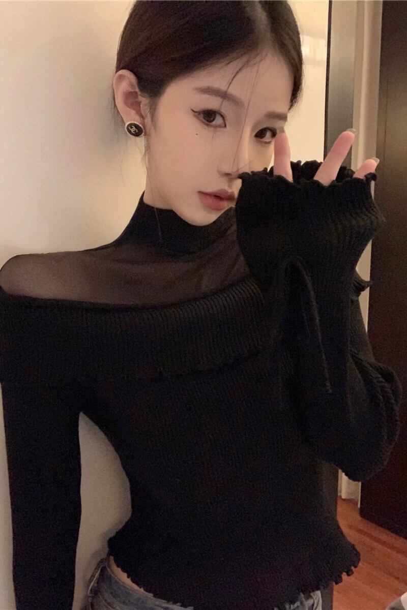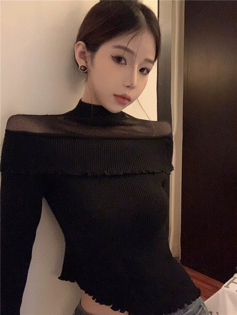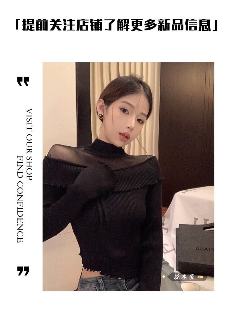 純粋な欲望スタイル黒メッシュステッチニットセーター女性の春と秋の新しいハーフハイカラースリムショートインナートップ ブラック スプリング 春物 オータム 秋物 0921927821940608