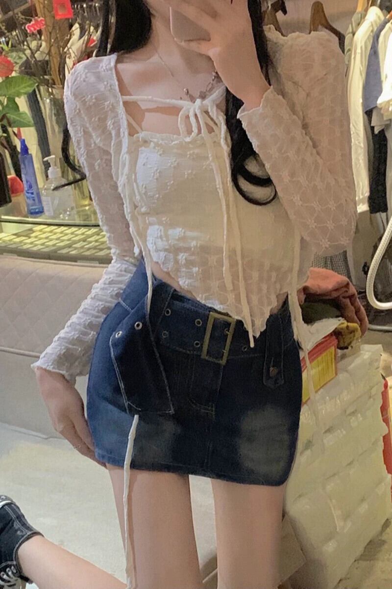 純粋な欲望のファッションスーツの女性の 2023 年初春の新作プリーツレースサスペンダーショートセクションスリムブラウストップ 2 点セット スプリング 春物 0921994170289994