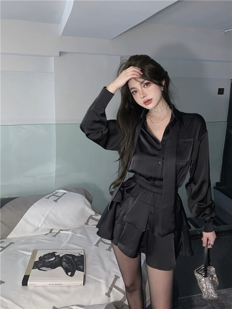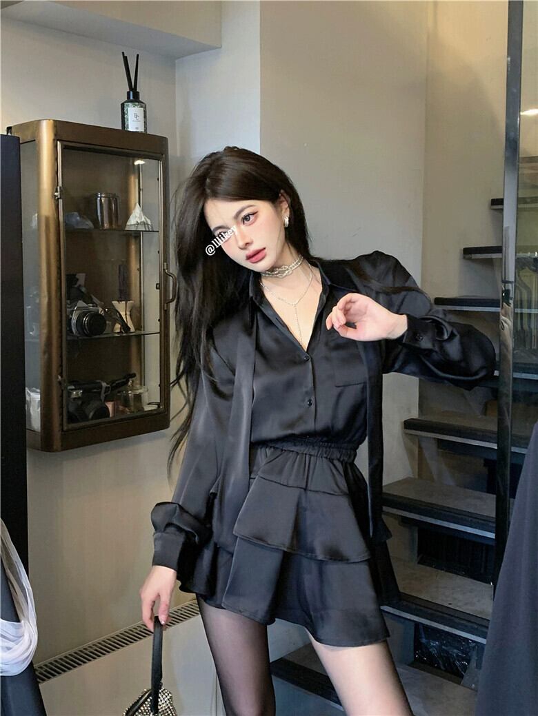 純粋な欲望の風ポロ襟黒ドレス女性春ウエスト痩身 a ラインチュチュスカート気質長袖ショートスカート ロング ブラック スプリング 春物 Aライン パニエ ペチコート 0921937862788599