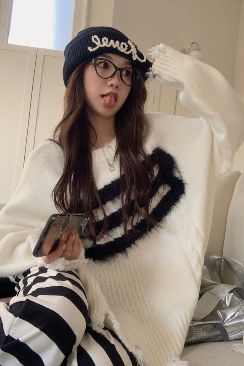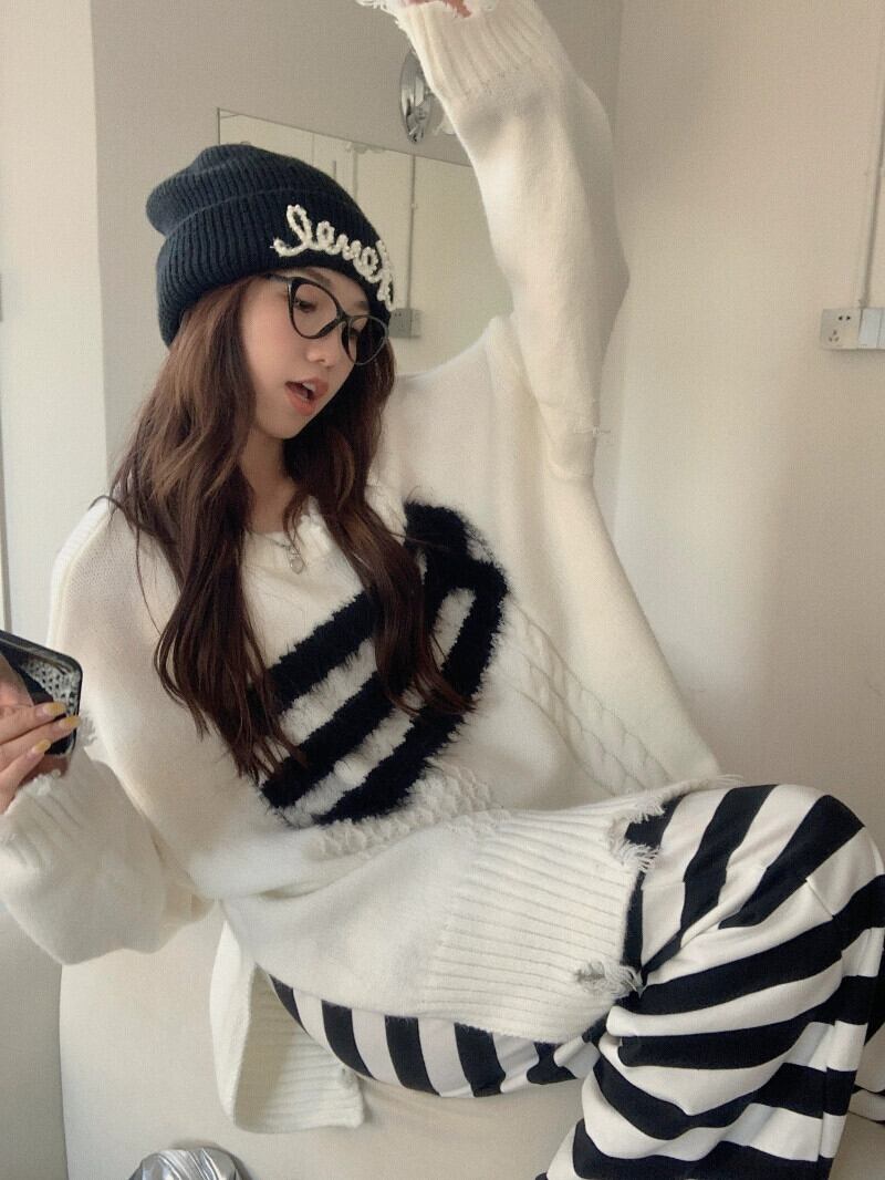 怠惰なスタイルのスプライシングコントラストカラー長袖ニットセーター女性の春 2023 新しいミッドレングスルーズスリムプルオーバーセーター ロング スプリング 春物 0921960709395028