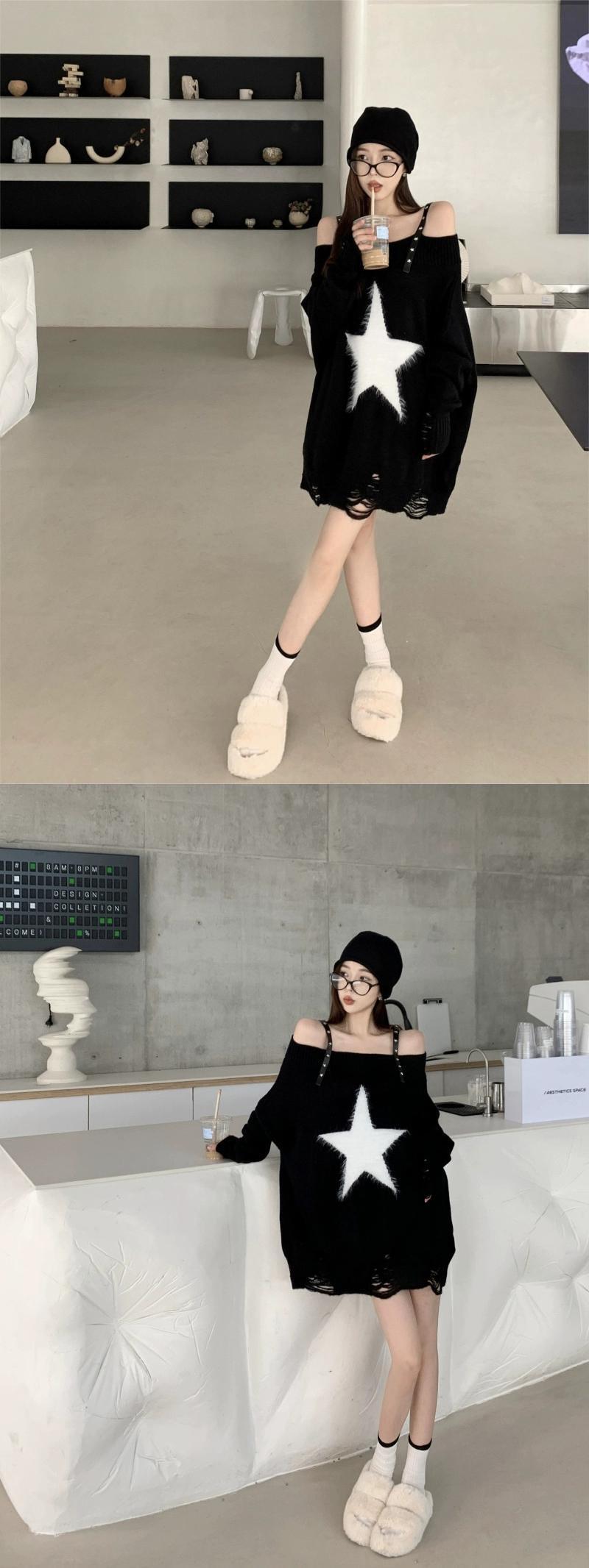 ホットデザインセンスニッチヒットカラースターセーター女性の2023春の新しい怠惰なスタイルプルオーバーオフショルダーニットセーター スプリング 春物 0921972638694258