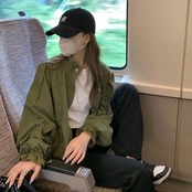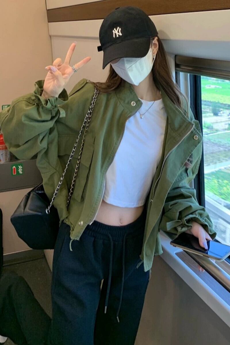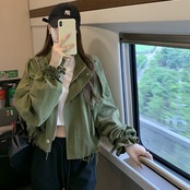 アメリカンレトロアーミーグリーンショートツーリングジャケットレディース2023年初春新作ゆったり薄手ジッパー長袖トップス ロング スプリング 春物 0921929999889785