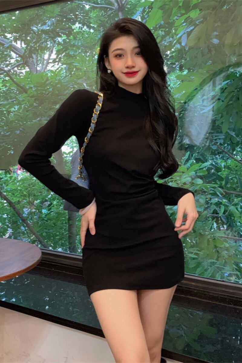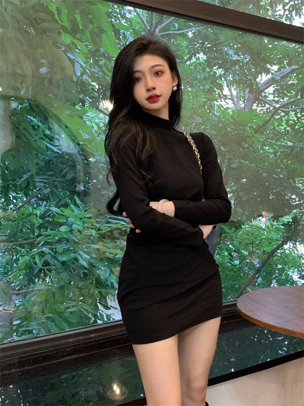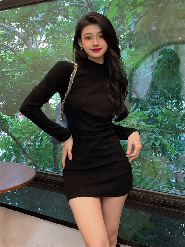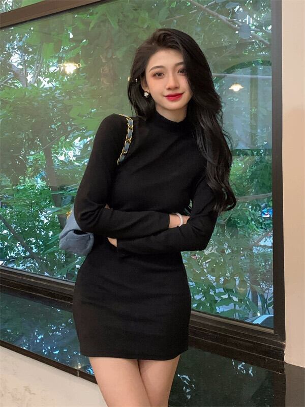 ニッチデザインセンス黒長袖ドレス女性の春と秋 2023 新しいオールマッチ自己修養スリムボトムショートスカート潮 ロング ブラック スプリング 春物 オータム 秋物 0921944528152675