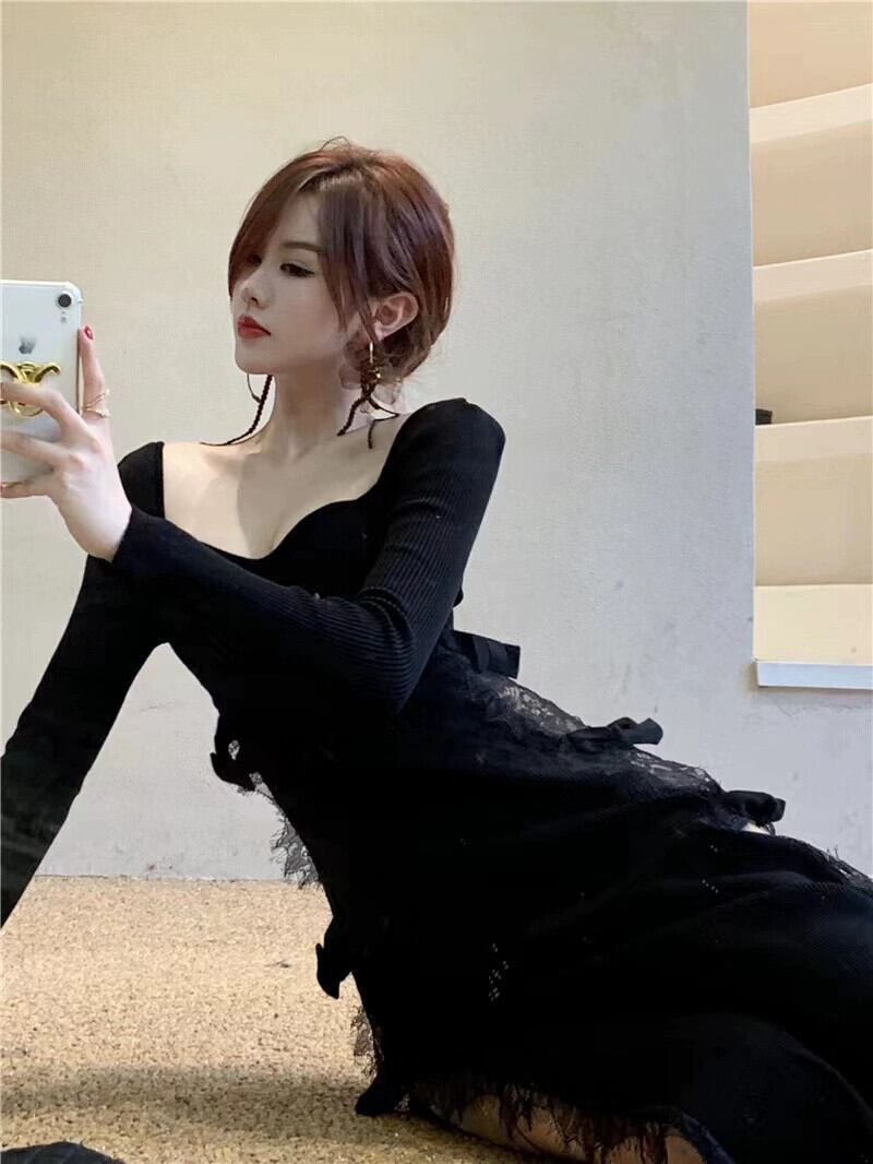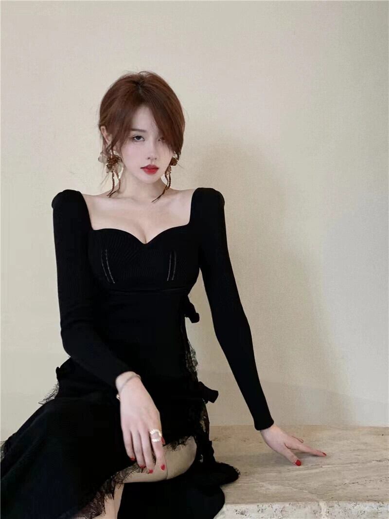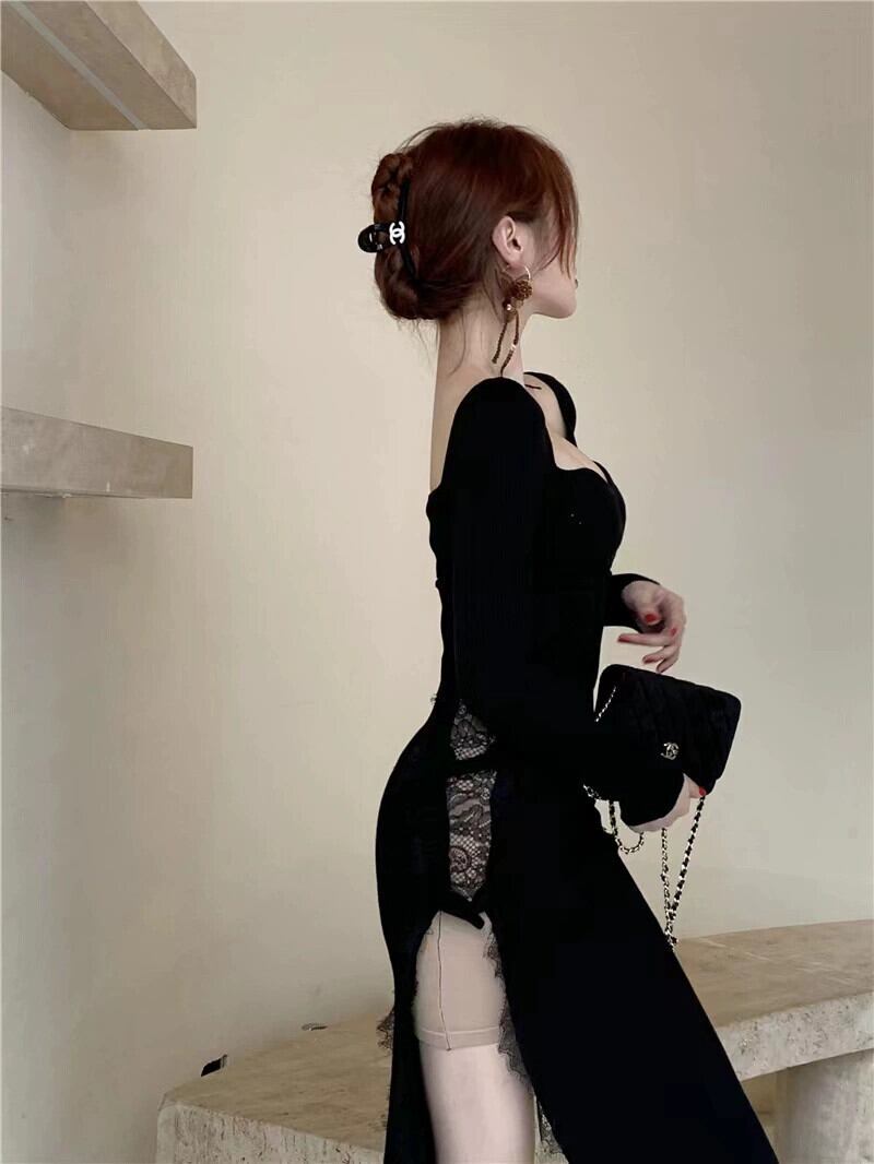 純粋な欲望のレースステッチニットドレス女性の春と秋のインナー長袖スカートフレンチセクシーなハイスリットロングスカート スプリング 春物 オータム 秋物 0921962922292056