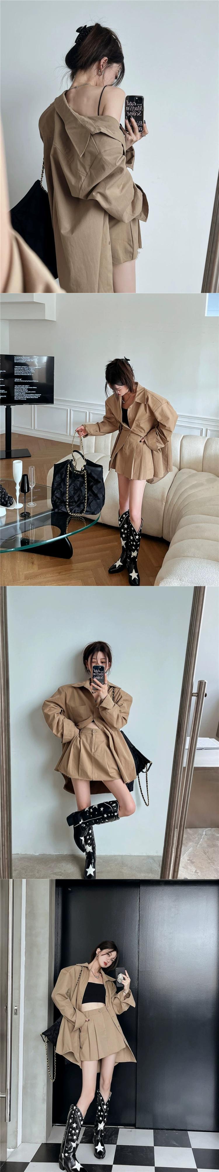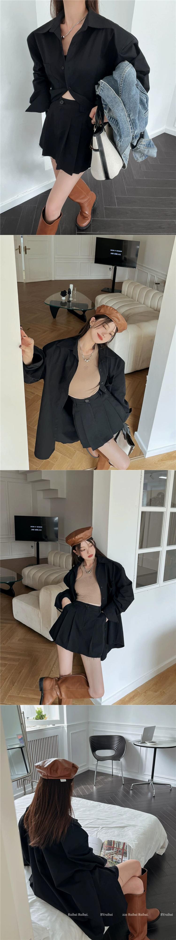 色:カーキシャツジャケット,黒のシャツジャケット,カーキ色のスカート,黒スカート