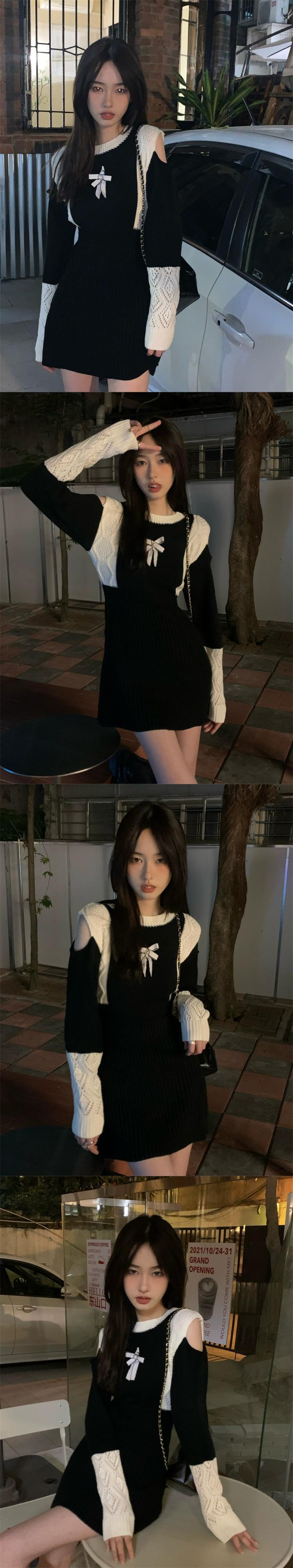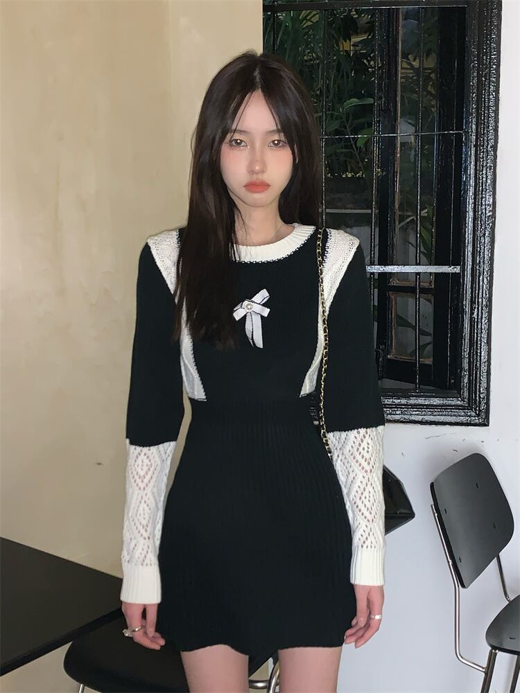 レトロな小さな香りのよい風長袖ニットドレスの女性の 2023 春の新デザインウエスト痩身中空スカート ロング スプリング 春物 0921945403605112