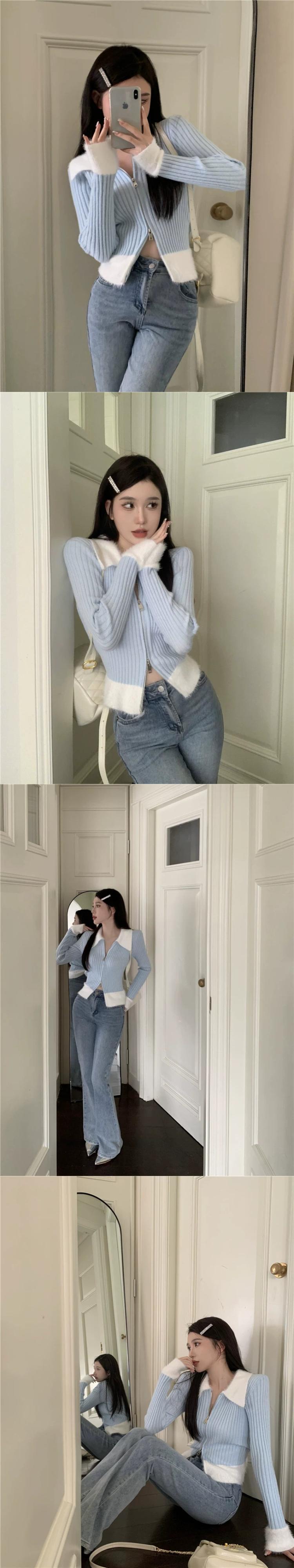 甘い風の毛皮の襟スプライシングコントラストカラーニットセーターコート女性春と秋 2023 新しいショートセクションスリムカーディガントップ 大人ガーリー スウィート キュート カジュアル スプリング 春物 オータム 秋物 0921987186646844