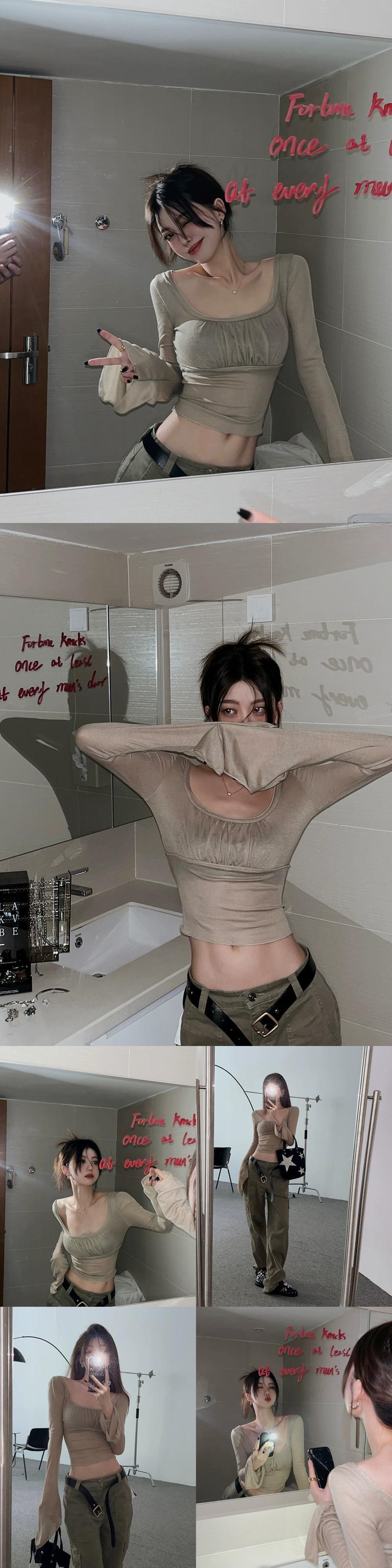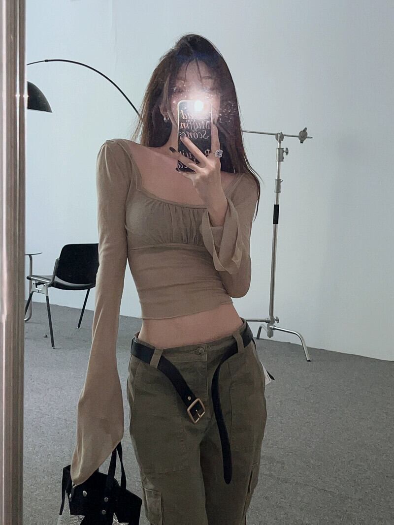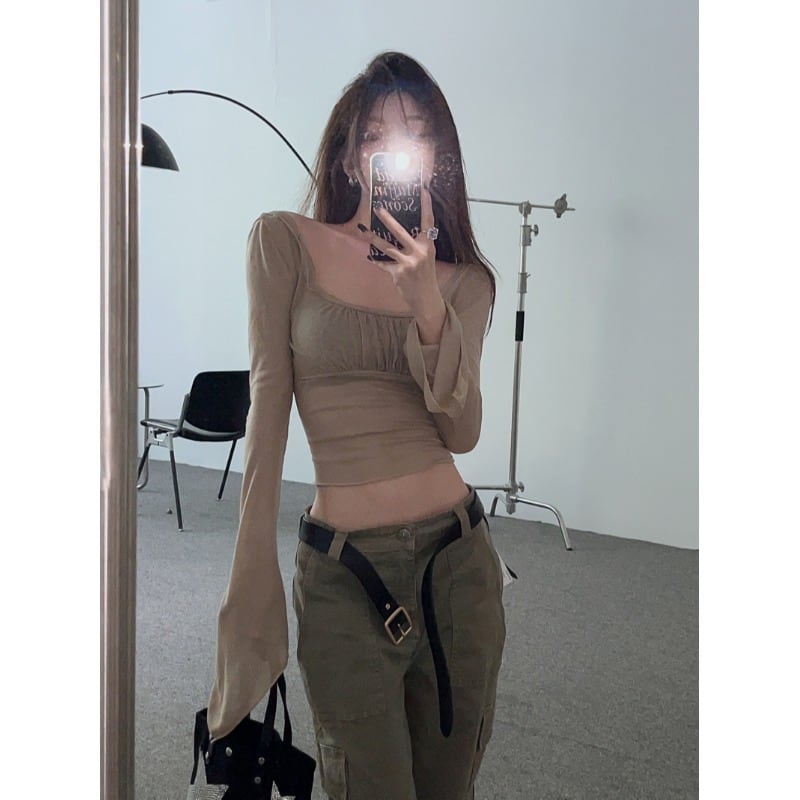 インおしゃれトランペットスリーブ長袖Tシャツレディース2023春新作プリーツウエスト薄いショート部薄いトップ潮 ロング スプリング 春物 0921999068493890