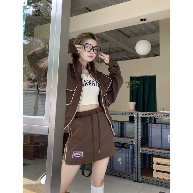レトロスタイルのファッションスーツ女性 2023 春の新スタンドアップカラーセーターコートハイウエストスカート 2 点セット ハイウェスト スプリング 春物 0921949706635552