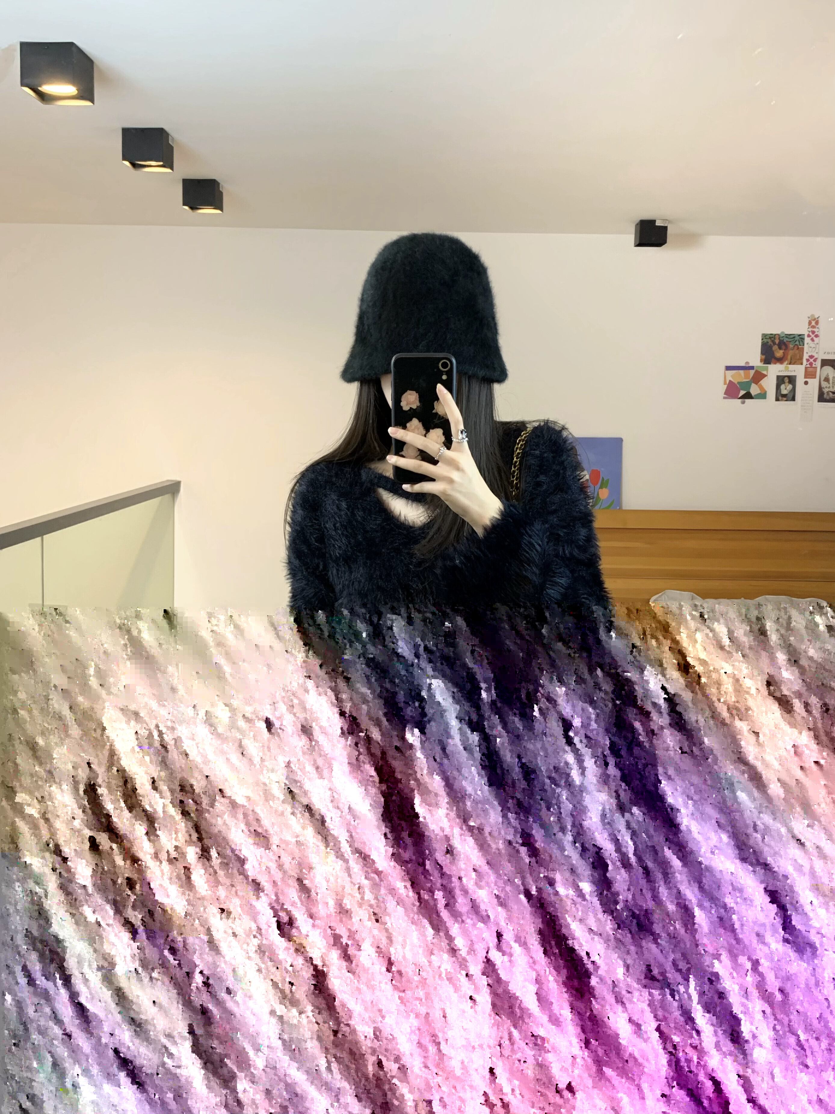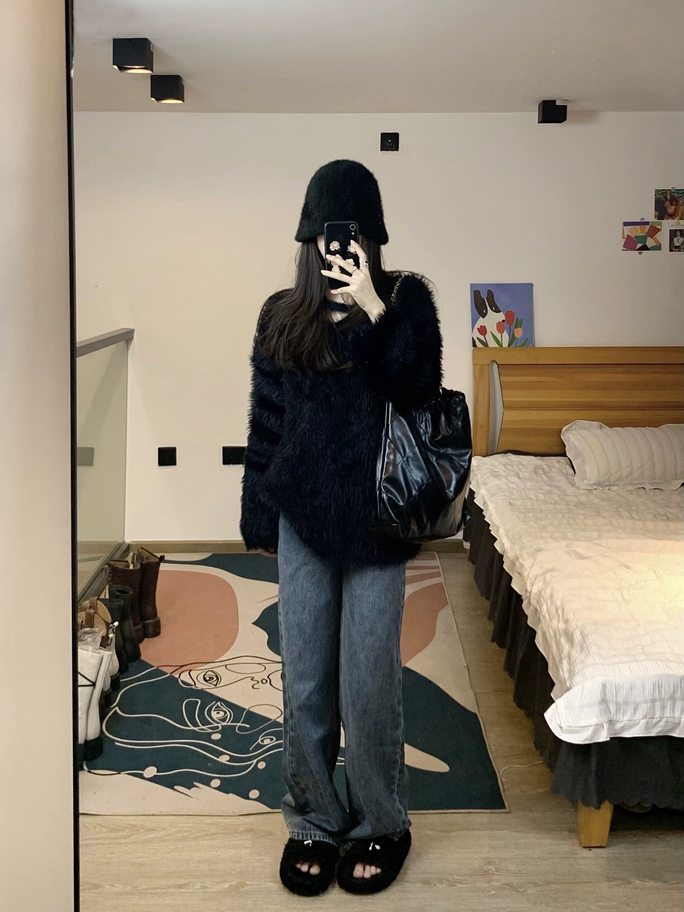 怠惰なスタイル模造ミンクファー V ネックプルオーバーセーター女性の冬の 2023 新しいファッションオールマッチ黒ニットトップ ブラック ウィンター 冬物 Vネック 092191308932876