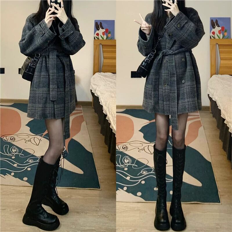 スタイルレトロコントラストカラーチェック柄ウールコート女性の春と秋 2023 新しいミッドレングスルーズオールマッチウールコート スプリング 春物 オータム 秋物 0921955626181750
