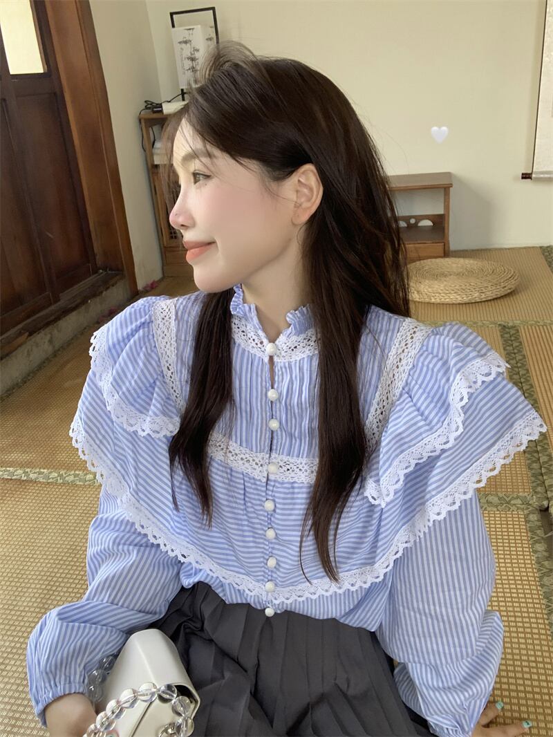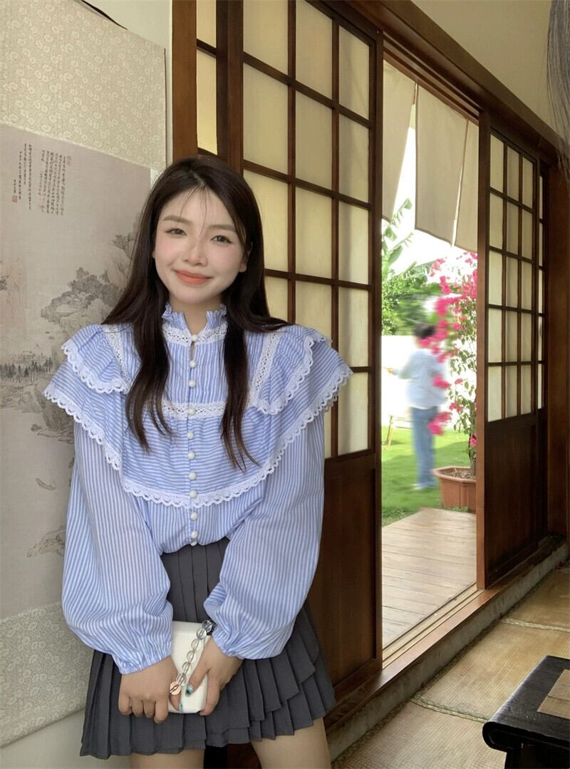 甘いスタイルのストライプ長袖シャツ女性の 2023 春と秋の新しいショートスタイルルーズスリムシングルブレストシャツ潮 ロング 大人ガーリー スウィート キュート カジュアル スプリング 春物 オータム 秋物 092199507781240