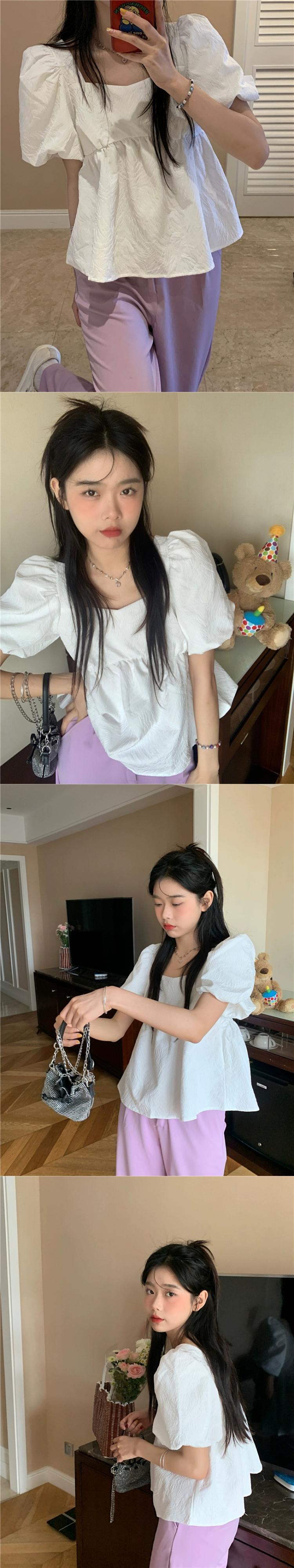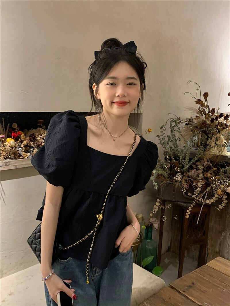 スクエアカラーパフスリーブ半袖シャツ女性の夏 2023 新しい気質オールマッチショートスリムスリムシャツ サマー 夏物 スクウェア 0921973291319724