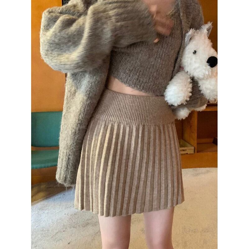 レトロな無地オールマッチニットスカート女性 2023 春の新作ハイウエスト薄い A ラインプリーツスカート ハイウェスト スプリング 春物 Aライン ソリッドカラー 0921944591296046