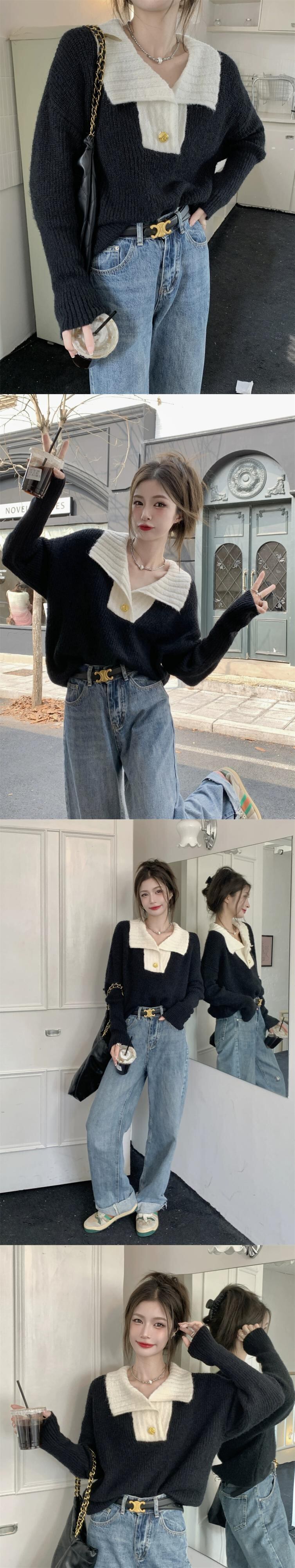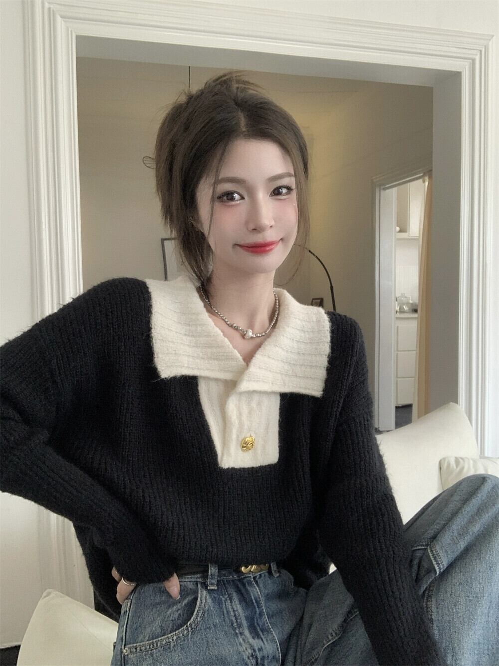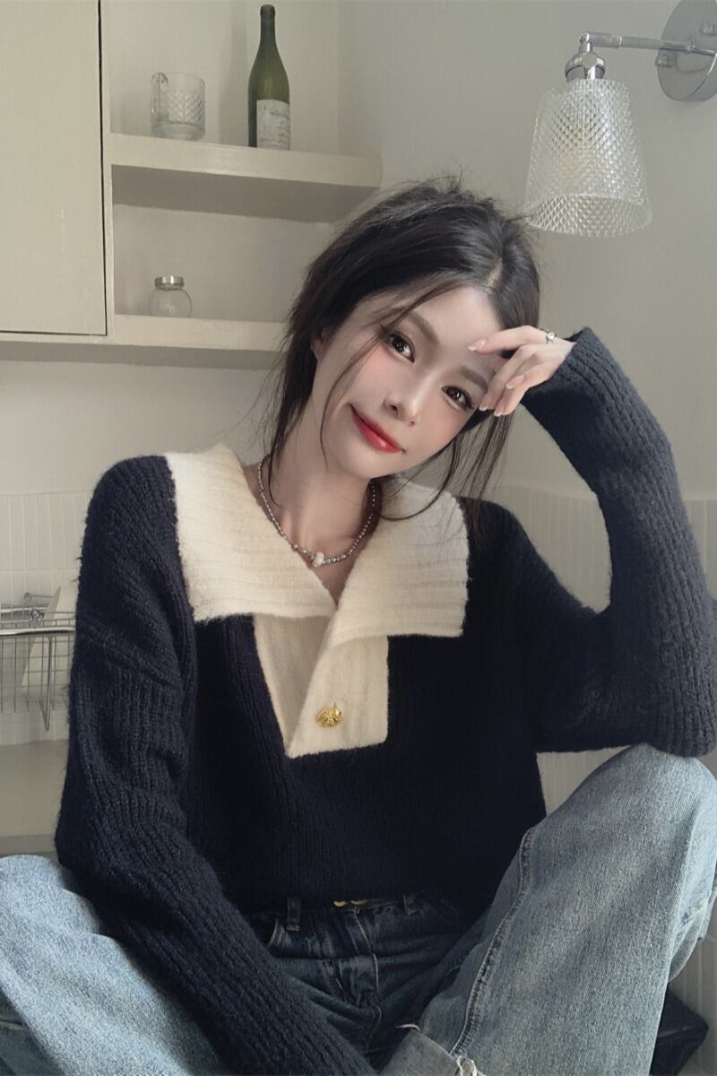 カラーコントラストラペルプルオーバーセーターのバージョンの女性の2023年春の新しい怠惰なスタイルの緩い気質オールマッチニットトップ スプリング 春物 0921920428114056